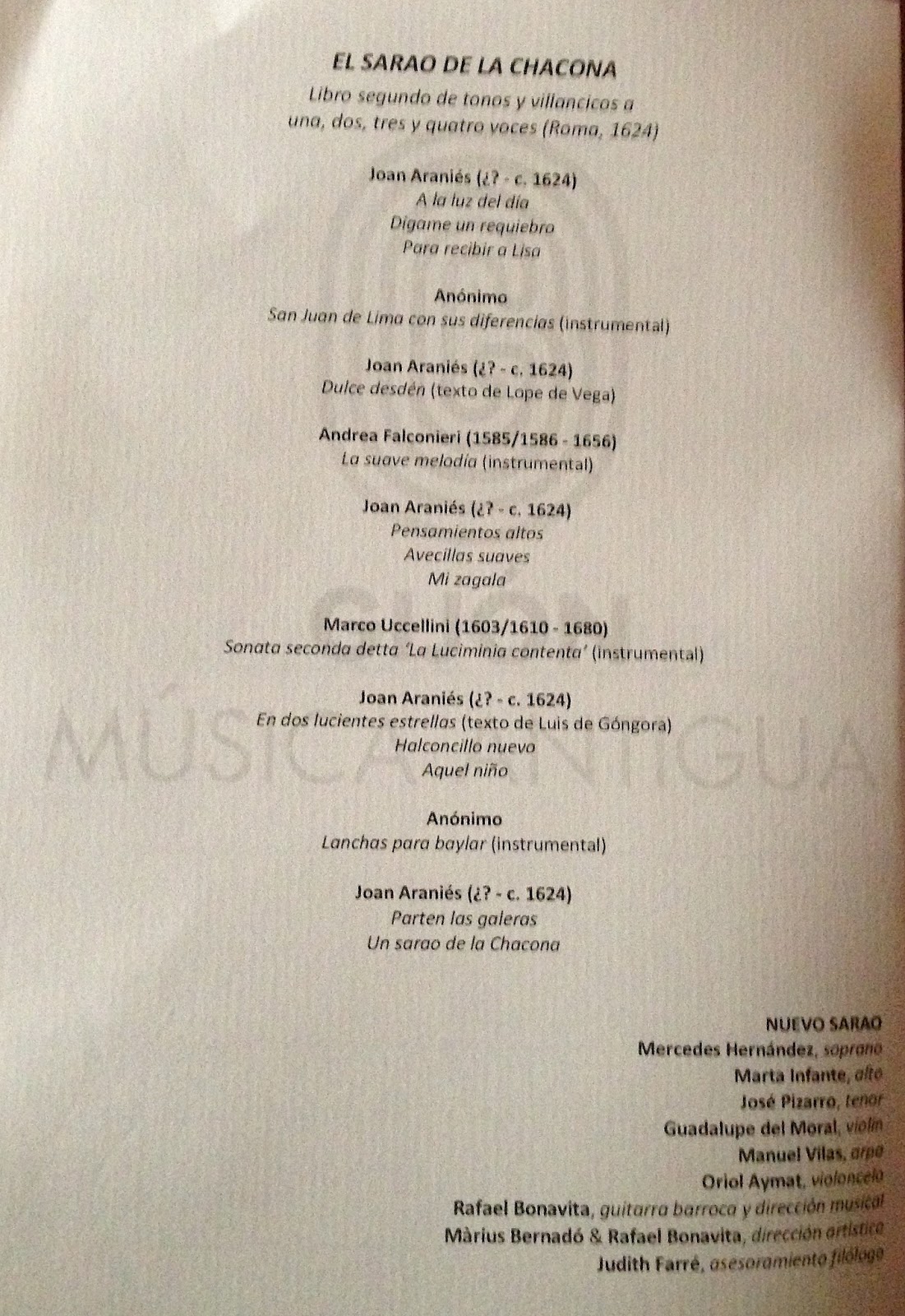 La información recogida en el programa explica tanto el intento de recordar el ambiente y paisaje sonoro de aquellas reuniones cortesanas o aristocráticas, saraos del siglo XVII, así como las relaciones políticas y culturales de Italia y España sin olvidar el reflujo con ultramar, siempre enriquecedor para ambas partes, y Nuevo Sarao podemos decir que consiguieron transportarnos a esos tiempos.