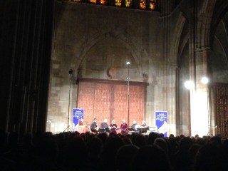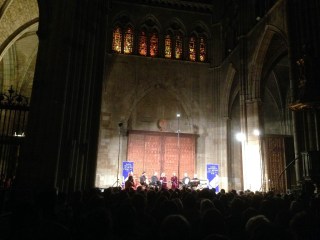 La ruta europea caminó a capella con las dos féminas hacia el escenario en el crucero y el Gloria, laus et honor tibi sit, contestado por los seis caballeros y el Christus resurgens parando en el coro, primeros «organum» donde la acústica catedralicia ayuda a multiplicar pero resta inteligibilidad. Los hombres compaginan voces e instrumentos, laúd, pandero y viola de brazo o fídula (alternando con el órgano portativo que alguno pensaría fuese el de Klais), siempre complemento o refuerzo a las seis voces empastadas para los orígenes polifónicos a dos y tres voces, monodia acompañada, voces iguales y mixtas, delicada y completa hermana Bingen y su O Virga ac diadema, hasta el Vitry de Vos qui admiramini… Gaude gloriosa, parada y encrucijada de caminos en León, ida y vuelta entre Montserrat y Santiago.