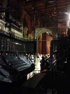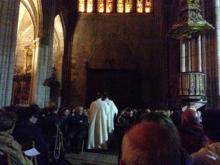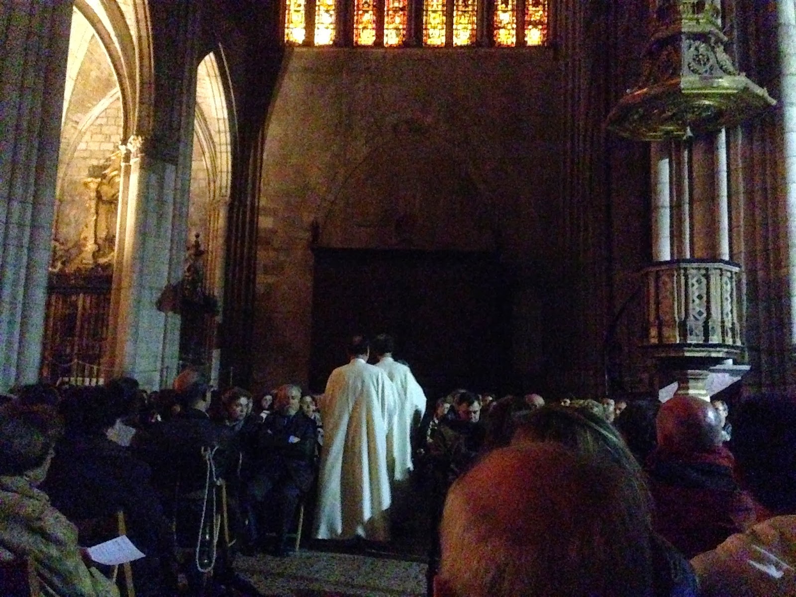 Salieron de la Sacristía entonando el Conductus Beata viscera Marie Virginis de Perotin El Grande, el de Notre Dame, «conductus» real por ser pieza cantada cuando el leccionario era conducido procesionalmente al sitio en el que se proclamaba la lectura, y así se dirigieron con cirios encendidos hasta el coro antes del Versus (esta vez un «conductus» monofónico) Vellus rore de San Martial de Limoges. Impresionante espectáculo, inédito seguramente para muchos y además en su entorno natural, esos organum melismáticos o floridos, técnica polivocal y adornos por debajo de canto principal.