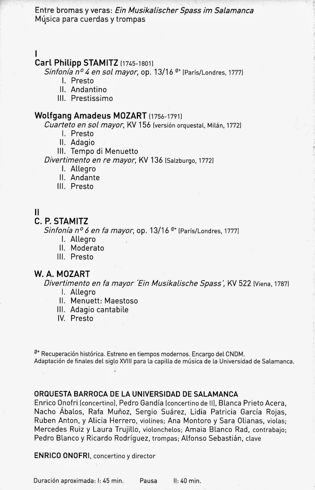 Martes 6 de mayo, 20:00 horas. Auditorio de Oviedo, Sala de Cámara: «Primavera Barroca». Orquesta Barroca de la Universidad de Salamanca, Enrico Onofri (concertino y director). Entre bromas y veras, obras de C. P. Stamitz y W. A. Mozart.