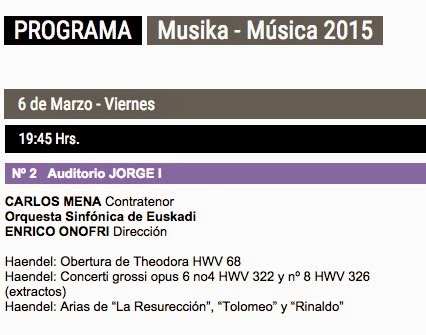 Viernes 6 marzo 2015, 19:45 horas: Músika-Música 2015, Bilbao. Palacio Euskalduna, Auditorio Jorge I: Carlos Mena (contratenor), Euskadiko Orkestra Sinfonikoa, Enrico Onofri (director): Haendel: Obertura de Theodora HWV 68; extractos de Concerti Grossi op. 6 Nos. 4 y 8; Arias de “La Resurrección”, “Tolomeo” y “Rinaldo”. Entrada: 10€.