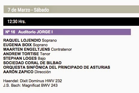 Sábado 7 marzo 2015, 12:30 horas: Músika-Música 2015, Bilbao. Palacio Euskalduna, Auditorio Jorge I: Raquel Lojendio (soprano), Eugenia Boix (soprano), Maarten Engeltjens (contratenor), Andrew Tortise (tenor), Stephan Loges (bajo-barítono), Sociedad Coral de Bilbao, OSPA, Aarón Zapico (director): Haendel: Dixit Dominus HWV 232; Bach: Magnificat BWV 243. Entrada: 10€.