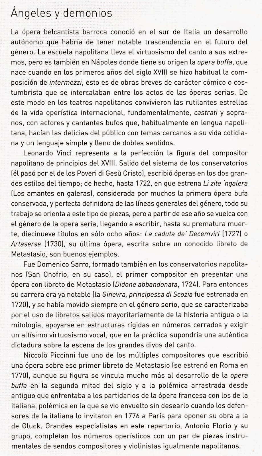 Las intervenciones instrumentales brillaron igualmente en el Concerto grosso en la menor (Marchitelli) donde el clave es más que relleno y percusión armónica, cinco movimientos de extraordinaria inventiva melódica en auténtica fórmula barroca, la movida Sinfonía de «Ginevra principessa di Scozia» (Sarro) y especialmente la Sonata para violín y cuerda en la menor (Fiorenza) con Ciccolini maestro y director junto a un instrumento por cuerda en virtuosismo y presencia de todos los músicos para una innovadora sonata barroca llena de pasiones, Nápoles como Sevilla con la luz del sur y el estilo contagioso e inimitablemente italiano.