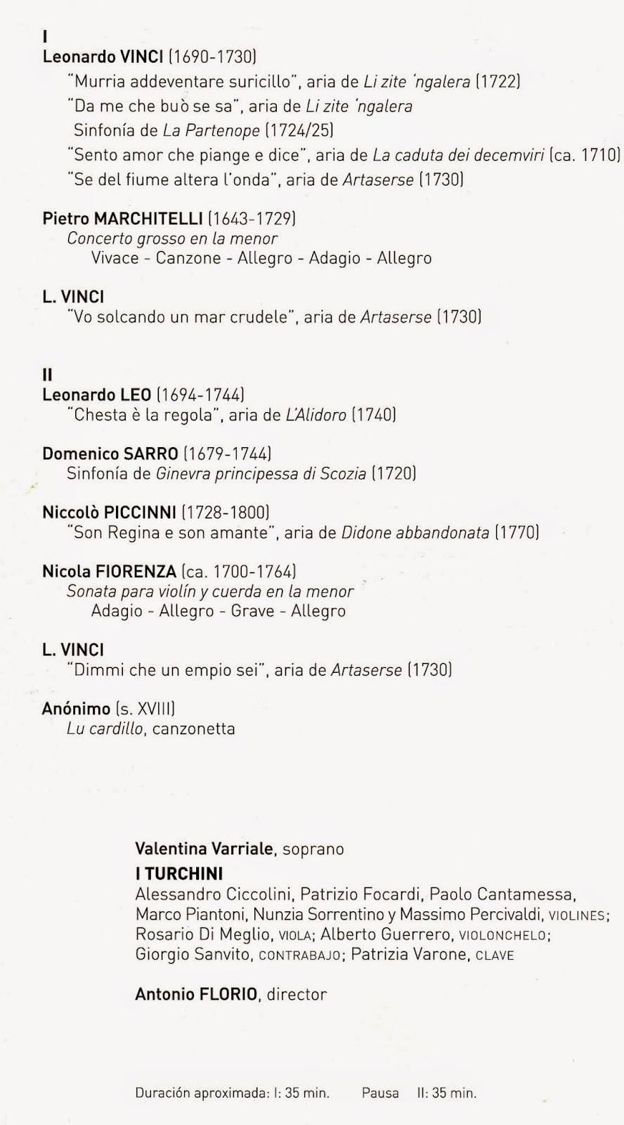 Tras ligeros chubascos la primavera barroca ovetense con la colaboración del CNDM volvió a florecer este jueves de la mano del maestro Antonio Florio al frente de I Turchini con un programa donde brilló con luz propia la soprano Valentina Varriale, todo un descubrimiento del profesor de Bari que continúa sacándonos a la luz no ya el repertorio del barroco napolitano sino versiones limpias, contrastadas, con una formación pura de cuerda que funciona a la perfección con Alessandro Ciccolini de concertino con otros cinco violines más un instrumento por cuerda donde no faltó el clave de Patrizia Varone, complemento ideal de cuerda percutida redondeando un continuo presente, auténtico cimiento tímbrico para un sonido global siempre poderoso, limpio, con ligeros problemas de afinación por este calor húmedo asturiano aunque consiguiendo siempre convencer.