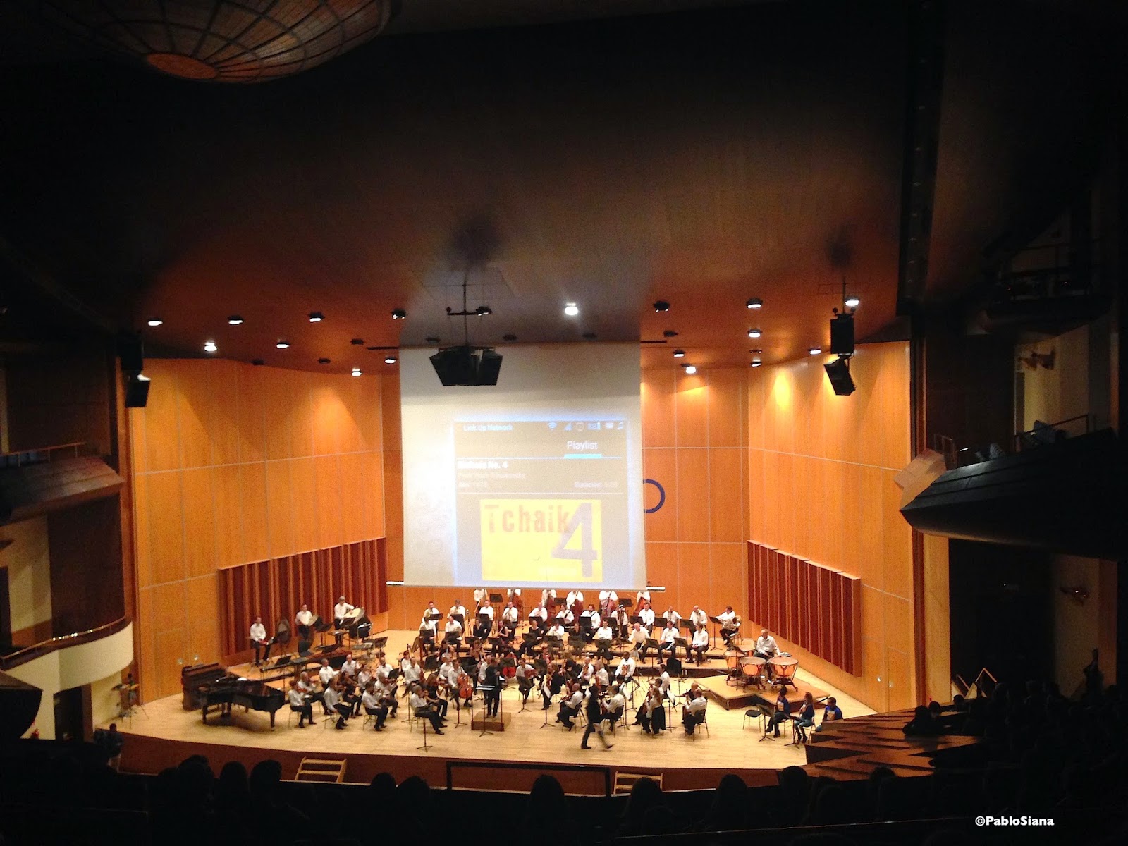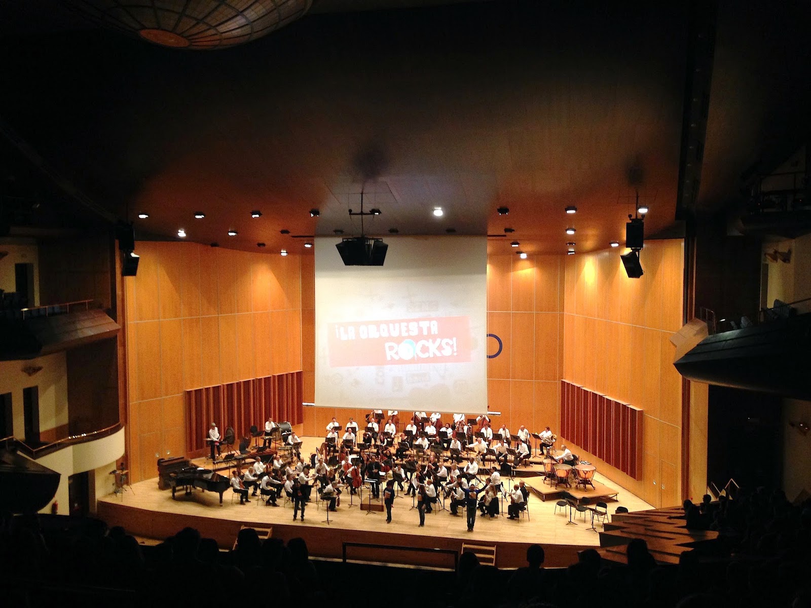Pasatiempos musicales proyectados en la gran pantalla sobre el escenario mientras van ocupando sus localidades «profes y nenos» en una organización impresionante de recursos humanos, debiendo felicitar a tantos implicados: Policía Local, Protección Civil y todo el personal del Auditorio, aunque seguro que me olvido de algunos. Claro que el concierto ya arrancaba en el bus, ensayando los últimos pasajes, repasando letras, todos «enganchados», hasta un servidor con su camiseta «ad hoc».