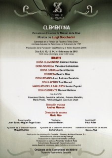Sábado 16 de mayo, 19:00 horas. Teatro de La Zarzuela: «Clementina«, zarzuela en dos actos de Ramón de la Cruz y música de Luigi Boccherini. Director musical: Andrea Marcon. Director de Escena: Mario Gas. Entrada butaca: 42 €.