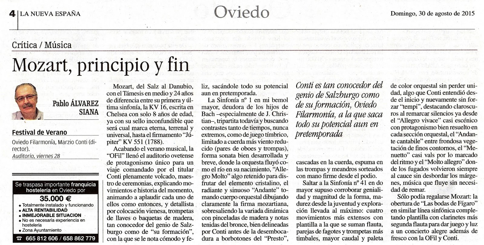 Conti volvió al podio realmente con las pilas cargadas, superados malos tragos anteriores y físicamente recuperado de su espalda, como un verdadero atleta tras la experiencia futbolística del pasado domingo y detallista al máximo, optando por la colocación vienesa (violines enfrentados, cellos y violas enfrente, y tres contrabajos al fondo e izquierda, pero también en la elección de trompetas de llaves o baquetas de madera para los timbales modernos, buscando sonoridades limpias y mostrándose tan conocedor del genio de Salzburgo, dirigiendo de memoria todo el programa, como de su formación, con la que se le nota cada vez más cómodo y feliz, sacándole todo su potencial aún en esta pretemporada (el día 4 de septiembre tomará la batuta el joven mejicano Iván López-Reynoso).