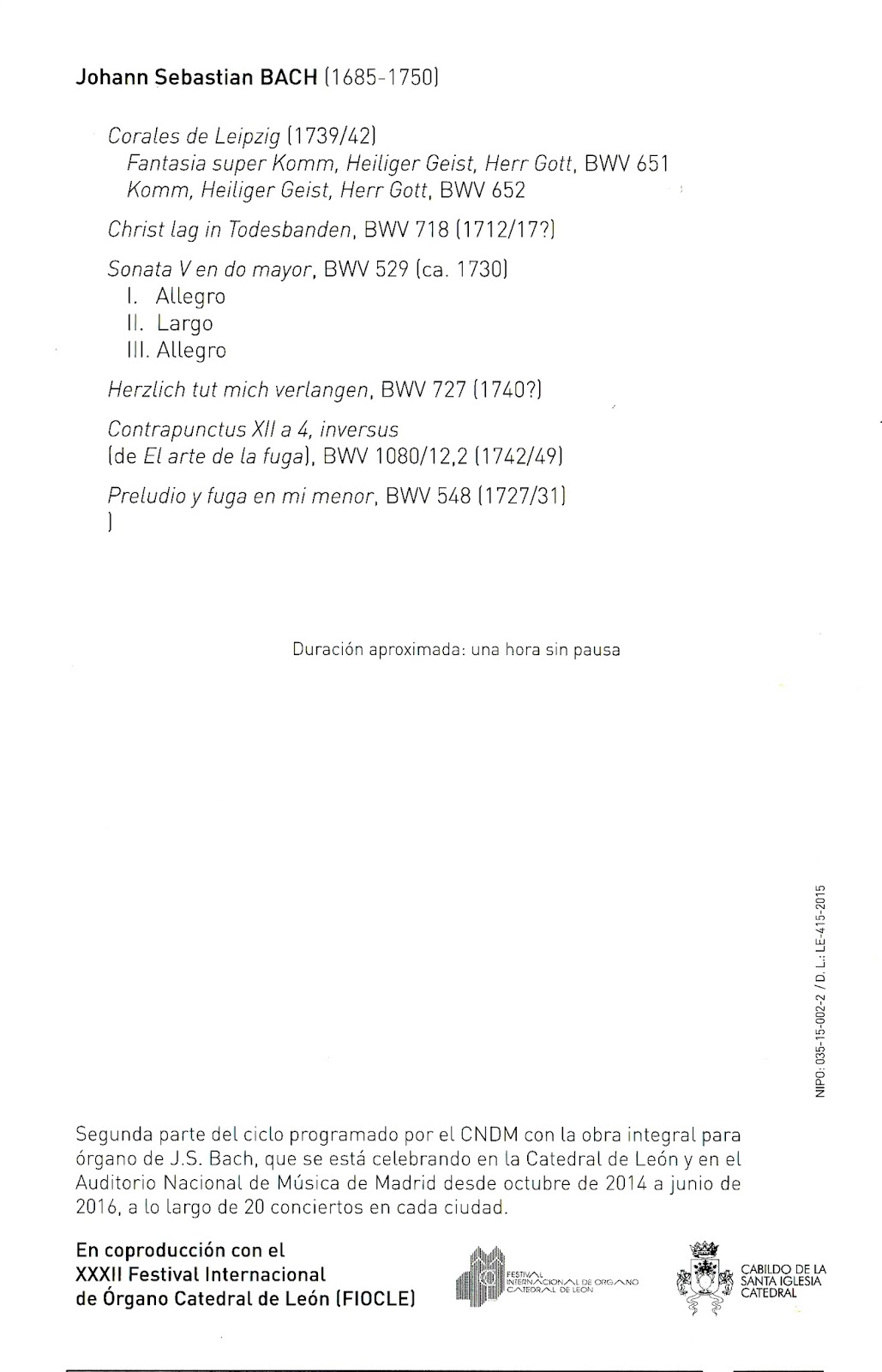 Continúan los jueves con la segunda parte de la integral de órgano de Bach en la Catedral de León, que el sábado en el Auditorio Nacional se convierte en «Bach Vermut«, un hito en nuestra historia musical, que nos traía de nuevo a casa a nuestro intérprete español más internacional, actualmente afincado en EE.UU. pero con agenda mundial completa que esta semana española incluye además de León y Madrid, la Semana de Música Religiosa de Avilés donde además de Bach le tendremos con sus obras más habituales en los conciertos: Saint Säens, Widor o Reger, que también forman parte de sus cursos en la Universidad de Indiana, la Ball State University, la Universidad de Baylor (Tejas) e incluso en el Conservatorio de Moscú o la