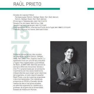 Y es que Raúl Prieto (Navalmoral de la Mata -Cáceres-, 1979), al que descubrí hace seis años en el defenestrado Festival de Órgano de Asturias, ha tocado en los mayores templos mundiales de la música de órgano: la catedral de Milán, el Victoria Hall de Londres, el Teatro Mariinsky de San Petersburgo o la sala de conciertos central de Moscú, donde se halla el órgano más grande de Asia, así como el órgano del Disney Concert Hall de la Filarmónica de Los Ángeles, y mantiene un dúo único en España con la pianista Maria Teresa Sierra. Imposible reflejar su amplio currículo y palmarés aunque no quiero olvidar que con 27 años le nombraron asesor artístico e intérprete asociado de la OCNE y divulgador, haciéndose cargo de toda la actividad de los órganos del Auditorio Nacional de Música de Madrid con su «Proyecto Órgano» cuyos resultados propiciaron un titular como el del periódico ABC: «El órgano sale de las tinieblas».
