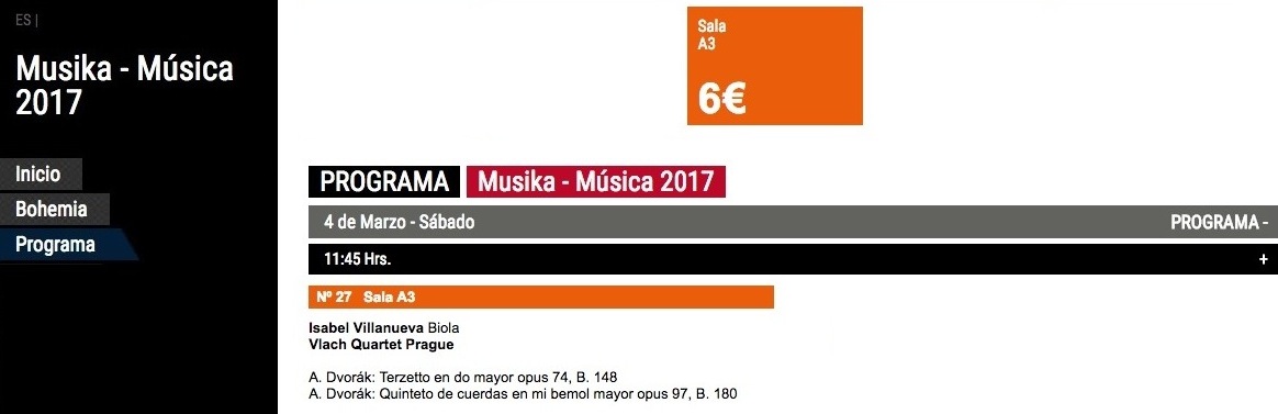 Sábado 4 de marzo, 13:30 horas. Palacio Euskalduna, Bilbao: «Musika-Música». Concierto Nº 28, Sala A-3. Nadège Rochat (violonchelo), Judith Jáuregui (piano). Obras de A. Dvořák. y L. Janáček. Entrada: 6 €.
