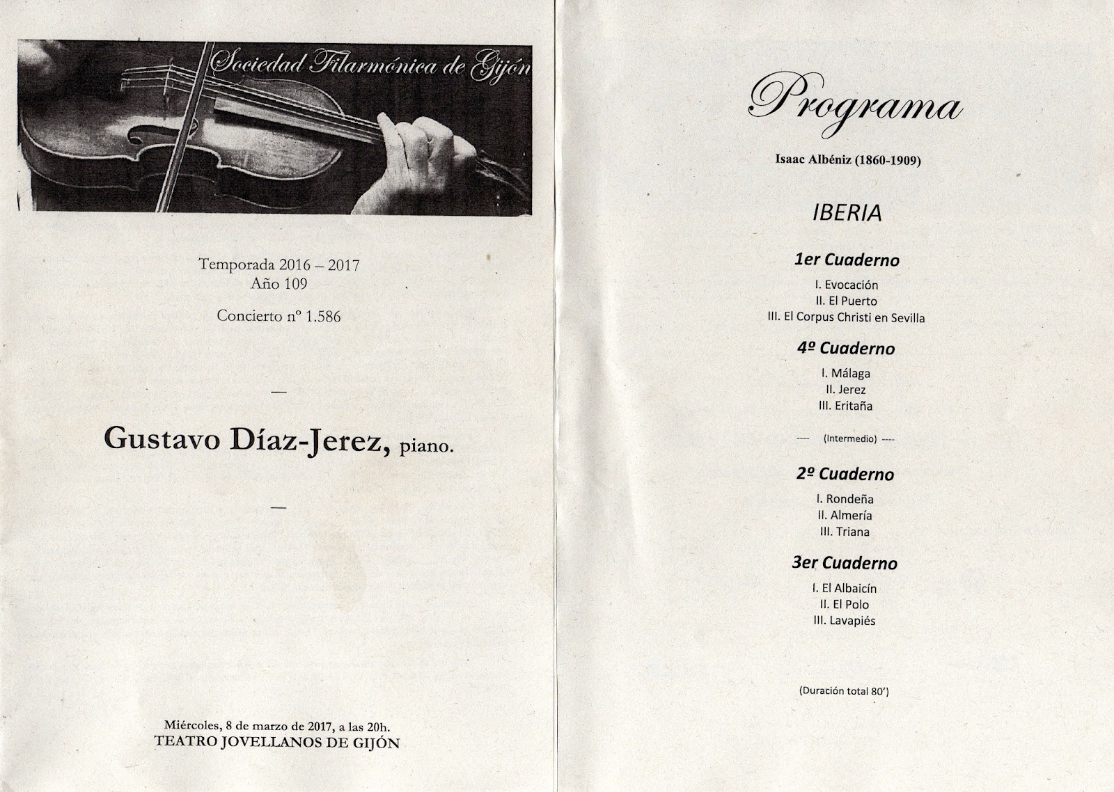 Miércoles 8 de marzo, 20:00 horas. Teatro Jovellanos, Gijón: Sociedad Filarmónica de Gijón, año 109, concierto nº 1.586. Gustavo Díaz-Jerez (piano): Iberia (Albéniz).