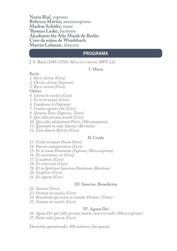 Sábado 1 de abril, 20:00 horas. Oviedo, Conciertos del Auditorio: Nuria Rial (soprano), Rebecca Martin (mezzo), Markus Schäfer (tenor), Thomas Laske (barítono), Akademie für Alte Musik de Berlín, Coro de niños de Windsbach (Windsbacher Knabenchor), Martin Lehmann (director). J. S. Bach: Misa en si menor, BWV 232 (H-moll-Messe).