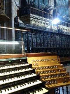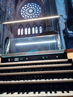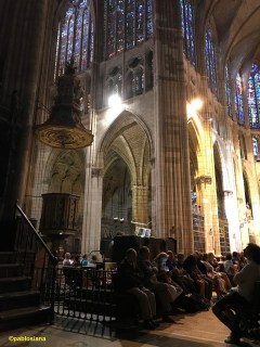Y casi con la misma duración que la propia misa, llegó la «Improvisación» sobre el Veni Creator. Di Rosa comienza un nuevo viaje imbuido por Messiaen aún resonando en piedras y vitrales del que no sabemos dónde terminará, «ires y venires» buceando en los timbres encontrados, reutilizados, vistiendo y desvistiendo la secuencia medieval, estremecimiento de cardenales, el himno del siglo IX que este sábado dedicábamos a Pentecostés una semana después, la llamada del Espíritu Santo, más lenguas de fuego del dragón escupiendo fortísimos aldabonazos en los tubos de ambas fachadas, discurrir de ríos vertiginosos cromáticos en las dos manos, el ancla del pedal sustentando el vendaval sonoro del por mí bautizado «bicho KLAIS«, múltiples lenguas incomprensibles por momentos antes de encontrar un leve remanso de paz, silencios inexistentes y derroche creativo del organista italiano en el idioma del francés.
