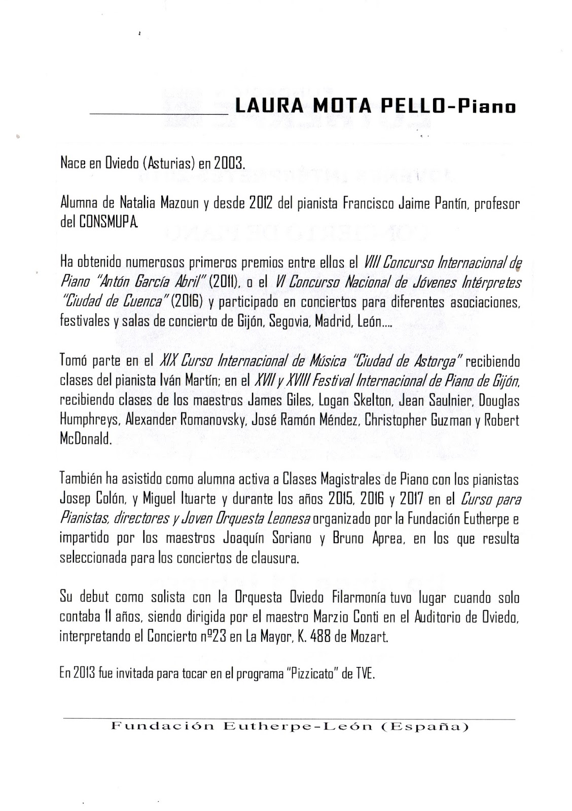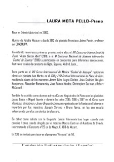 Laura Mota (Oviedo, 28 de febrero 2003) retornaba a la capital vecina con un programa hondo, potente, arriesgado y volviendo a demostrar su increíble madurez interpretativa tras su paso por Aarhus el pasado verano en su concurso internacional siendo una de las 20 finalistas de todo el mundo en la categoría A (nacidos entre 2003 y 2008), y la única no oriental en clasificarse para la final, lo que indica el nivel de nuestra joven intérprete demostrado en otros eventos donde siempre admira amén de premios o distinciones.