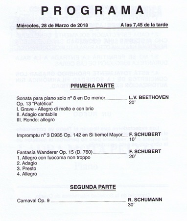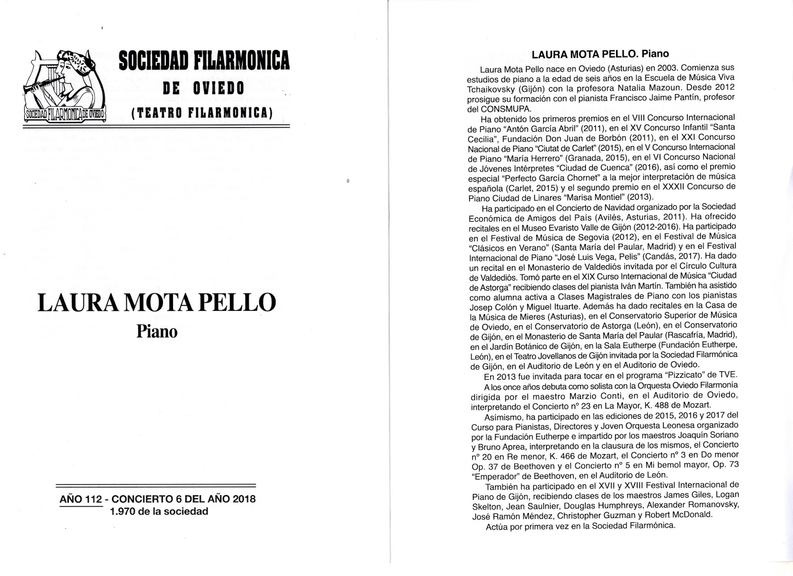 Para su primera actuación en la sociedad presidida por Jaime Álvarez-Buylla la joven intérprete ovetense no escatimó en esfuerzo, recursos, memoria, ni dificultades técnicas con tres autores románticos cual piedras angulares de la literatura pianística: Beethoven, Schubert y Schumann que habrán sonado muchas veces en este mismo escenario en manos de figuras como Alicia de la Rocha, con quien ya se ha comparado a Laura Mota en cuanto a trayectoria y formación, Luis Galve, Arturo Benedetti, Nikita Magaloff o el mismísimo Sergei Rachmaninoff, por citar algunos Pianistas, con mayúscula, que dejaron su firma en el “Libro de Oro” de la Sociedad Filarmónica de Oviedo.