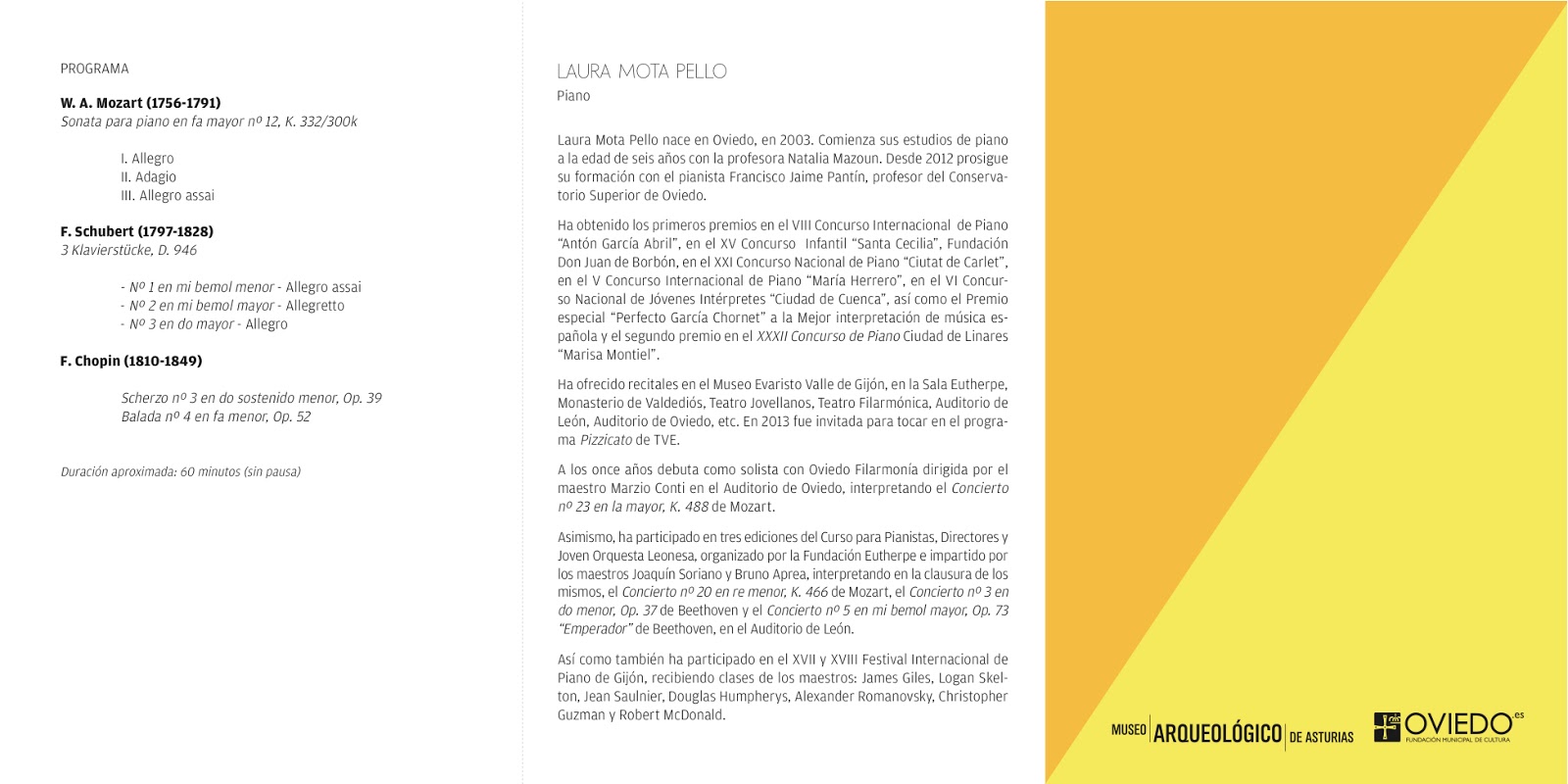 Jueves 19 de julio, 20:00 horas. Verano en Oviedo 2018, Claustro del Museo Arqueológico de Asturias: Laura Mota Pello, piano. Obras de Mozart, Schubert y Chopin.