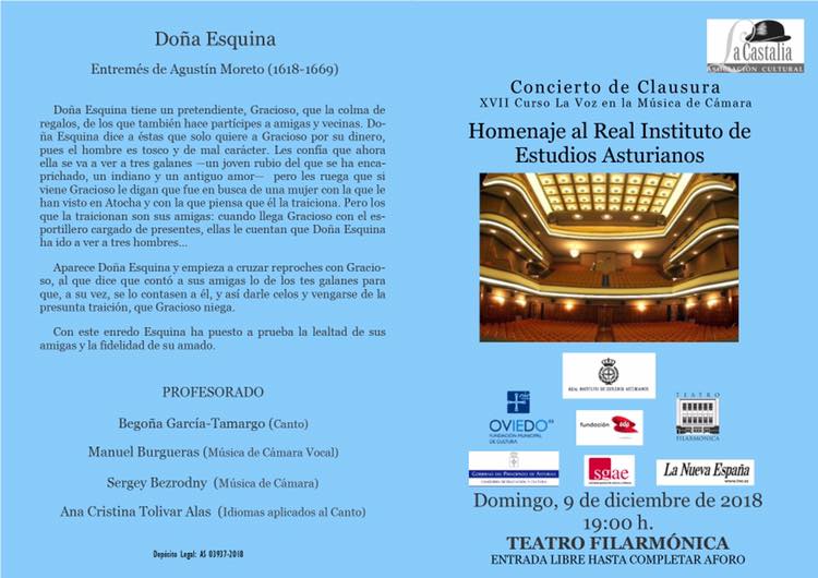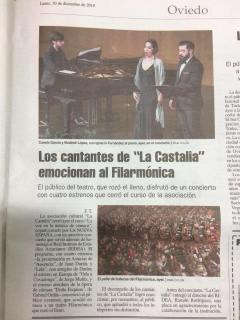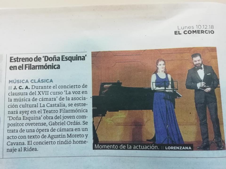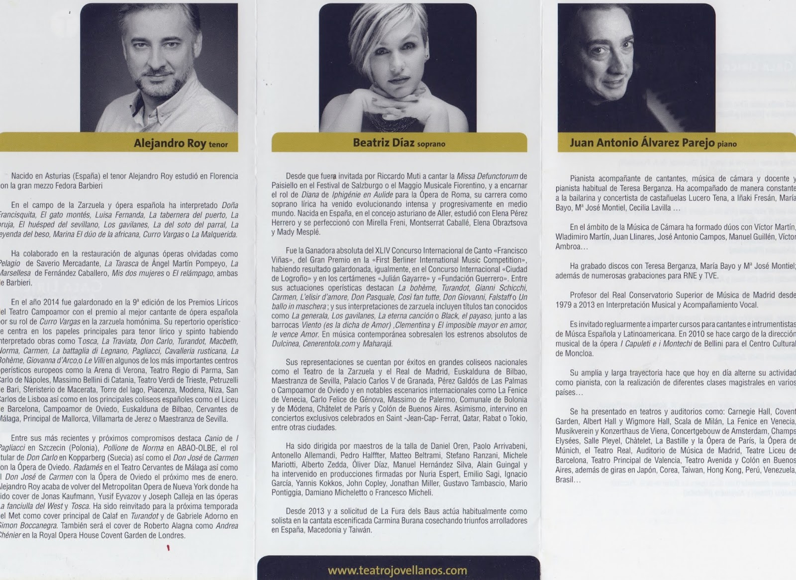 Miércoles 12 de diciembre, 20:00 horas. Teatro Jovellanos, Gijón: Gala Lírica Asturiana, Sociedad Filarmónica de Gijón. Beatriz Díaz (soprano), Alejandro Roy (tenor), Juan Antonio Álvarez Parejo (piano). Arias y dúos de Verdi, Cilea, Ponchielli, Catalani y Puccini. Entrada 26 €.