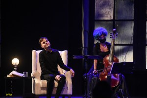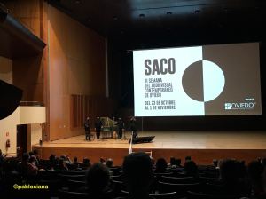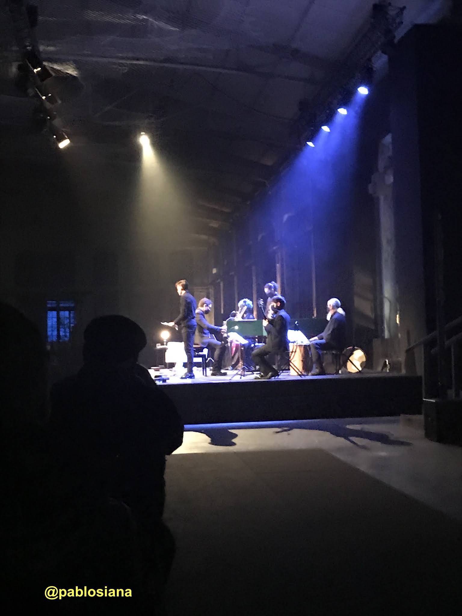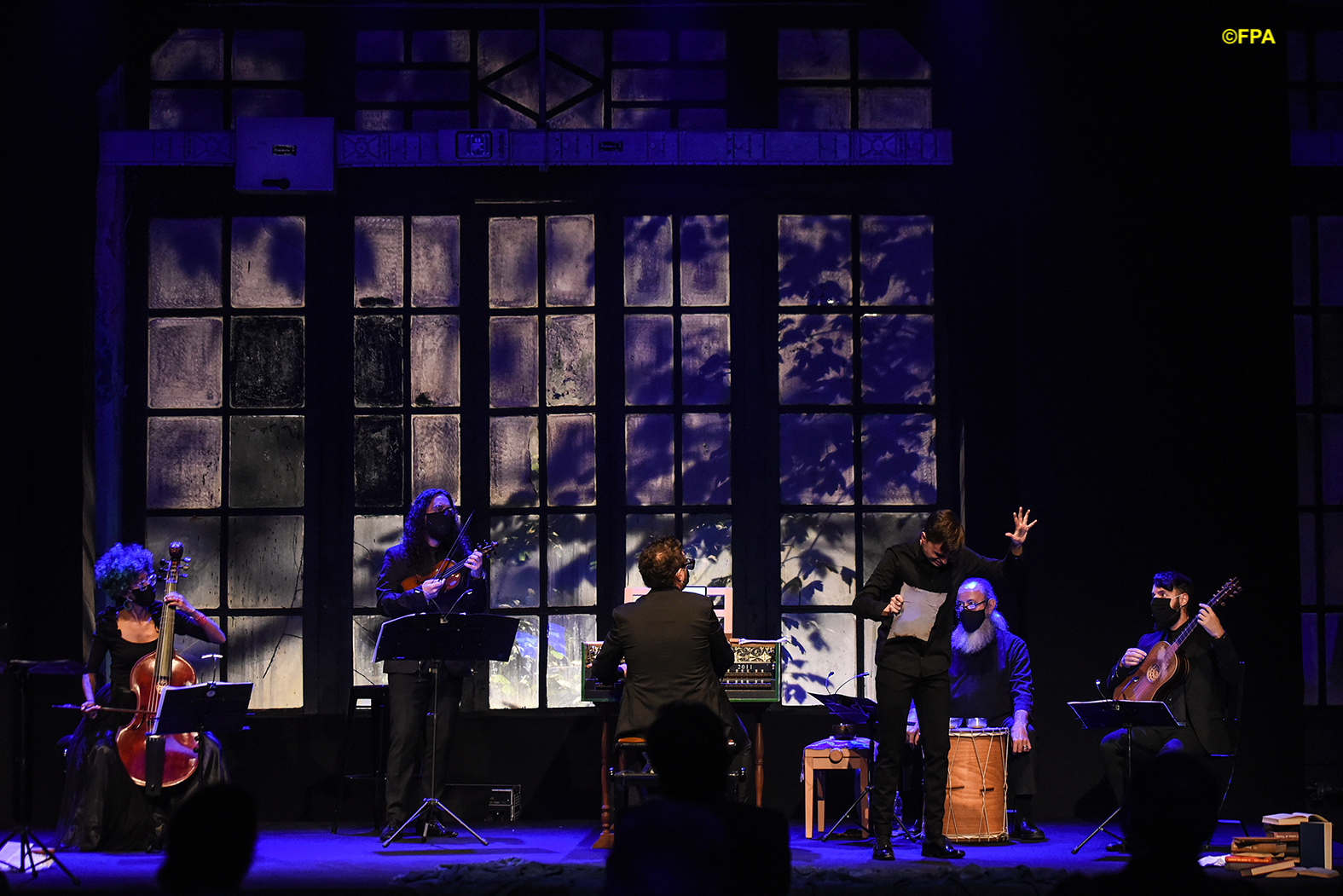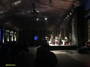 Sobre el montaje «Isla Locura» la propia Fundación lo describe así: «Este espectáculo poético-musical dirigido por Aarón Zapico, pretende simbolizar el hermanamiento de dos grandes tradiciones literarias, la castellana y la anglosajona, representadas en los escritores más importantes de la literatura universal«. Forma Antiqva tiene la virtud de apostar por formatos siempre novedosos, adoptando las mejores formaciones para ellos y nuevamente acertando de lleno con la elección del tenor cordobés Pablo García López para encarnar un particular Alonso Quijano en sillón con lámpara de mesa, rodeado de textos y libros, Cervantes y Shakespeare, declamaciones y canciones en un alarde escénico donde los cinco músicos le arroparon junto a luces bien buscadas y complicidades desde antes del comienzo en un repertorio donde los asturianos siguen siendo un referente (dejo algunas fotos de la FPA en Twitter© que reflejan mejor la lograda escenografía que desde mi posición lateral).