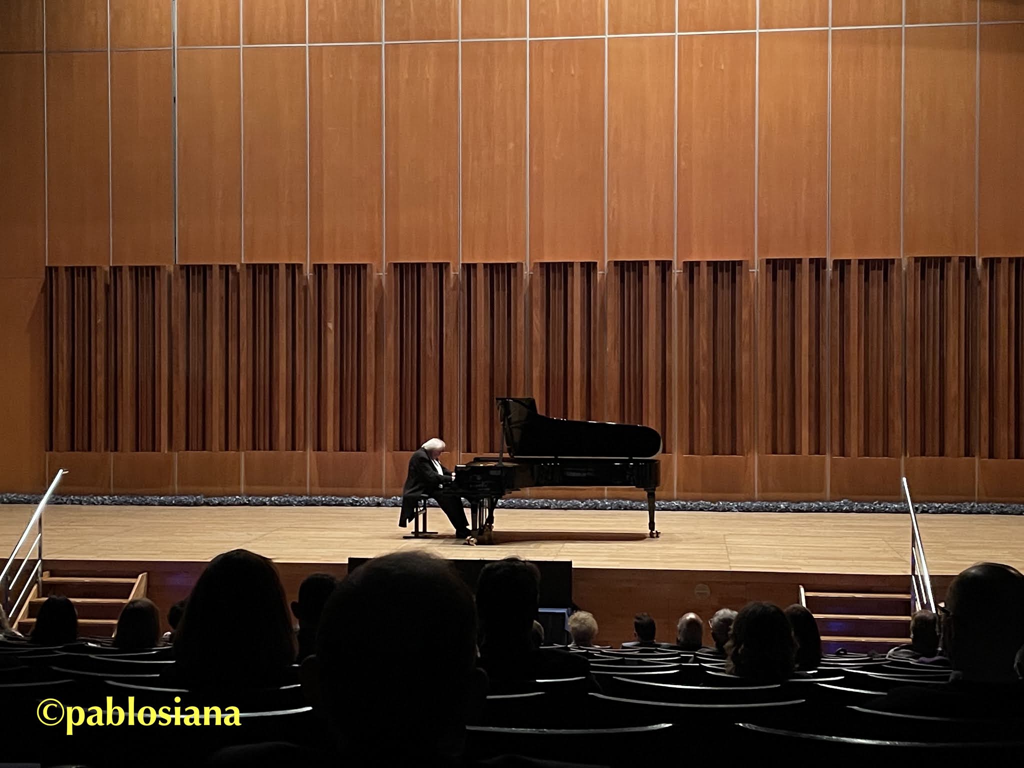 Cuatro polonesas de F. Chopin (1810- 1849) para la primera parte, esas danzas de concierto rítmicamente potentes que Sokolov milimetra cada una de ellas con la limpieza estratosférica, la potencia extrema y su lirismo expresivo, comenzando con la Polonesa en do sostenido menor, op. 26 nº 1, después la nº 2 en mi bemol menor, sin apenas pausa entre ellas, la independencia de manos con el volumen en su sitio y un pedales que nunca sobra cuando podemos escuchar cada nota presente y la importancia justa, las síncopas de la primera con ese ímpetu y trinos paradisíacos, arpegios divinos, súbitos románticos como pocos, la segunda de oscuro inicio contrastado y matizado al estilo Sokolov, el juego de las tonalidades menores que el Steinway redondea en las manos y pies del ruso, los cromatismos que culminan álgidos y precisos, el rubato exacto, las modulaciones precisas, el ritmo de polonesa inimitable y siempre distinto, magia también menor de la Polonesa en fa sostenido menor, op. 44 con el inicial «moderato» que crece en arrebatos extremos en ambas manos jugando desde los claroscuros que contagia a la siempre luz tenue del escenario, las melodías en terceras con idéntico volumen cantabile e izquierda «bailablemente ligera».