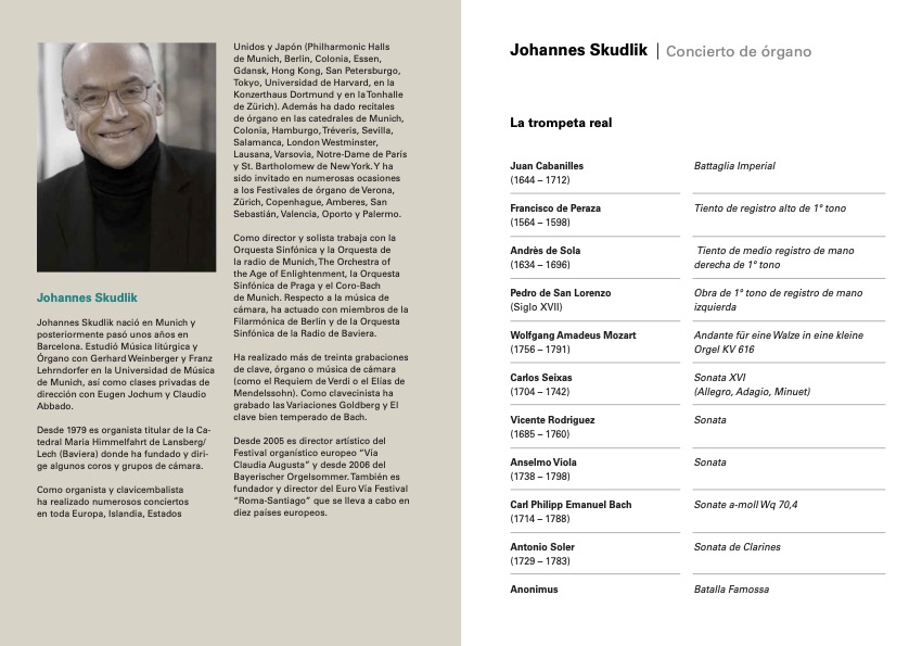 Quedaría cerrar este programa titulado «La trompeta real» (registro que casi todos los órganos poseen y este especialmente) con una Batalla Famossa, anónima española del siglo XVII para poner a máximo rendimiento y «pleno pulmón» esta joya organística de nuestro patrimonio cultural. Sobre la «Batalla» o «Batalha» añadir que fue muy apreciada por los compositores ibéricos del renacimiento y el barroco que se llevará a Hispanoamérica; muchas composiciones que aparecen como anónimas generalmente fueron realizadas por los religiosos que vivieron durante este periodo y en el que su oficio secular les permitía copiar o crear estas obras musicales como una habilidad más dentro de sus funciones eclesiales. El papel que el clero ha aportado a nuestra historia de la música merece una honda reflexión y nuestro órgano ibérico es la mejor voz, siendo el de Valdediós destacada, más en las manos de un maestro como Johannes Skudlik. Excelente repertorio el de este veterano intérprete y defensor del instrumento rey.