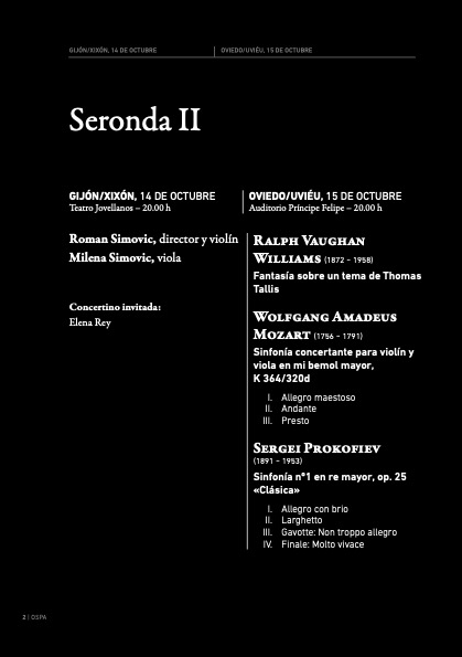 Viernes 15 de octubre, 20:00 horas. Auditorio de Oviedo, Seronda II: OSPA, Roman Simovic (director y violín), Milena Simovic (viola). Obras de: Vaughan Williams, Mozart y Prokofiev.