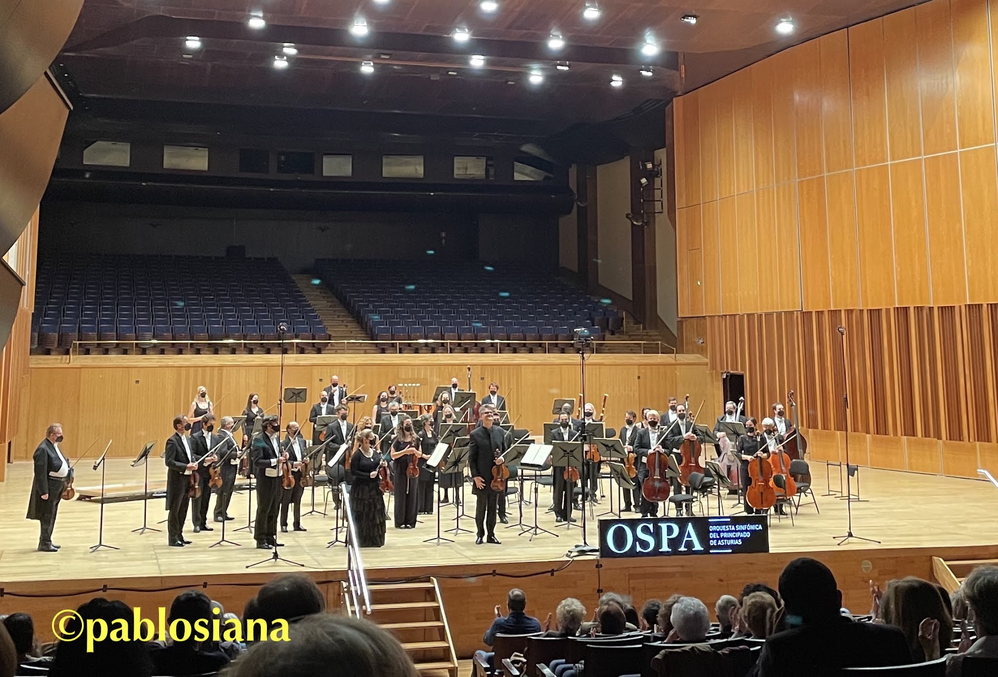 Todos sabemos que sólo hay un genio, Wolfgang Amadeus Mozart (1756 – 1791), capaz de aunar y romper desde la forma, sinfonía y concierto que conjugan amores, el de la viola en masculino dialogando con el violín femenino en su Sinfonía concertante para violín y viola en mi bemol mayor, K 364/320d, con los Simovic, Milena y Roman arropados por una OSPA que sumaba oboes y trompas sin perder sentido camerístico, solistas y directores la pareja, complicidad única de vida y sentido musical, la magia de la convivencia y el latir compartido. Obra amorosa de Mozart hacia la viola con una orquestación que la mima, la envuelve e iguala al violín, sin géneros, dos en uno capaces de arrancar un I. Allegro maestoso contundente y preciso donde la cadenza fue un regalo mayúsculo, la tristeza del II. Andante (el sentimiento de Mozart por la pérdida de su madre) que los Simovic sintieron cual Requiem solista con el «coro sinfónico» nuevamente de solos inmensos, para volverse operístico compitiendo con «La flauta del Campoamor» explosiva del III. Presto, el «más difícil todavía» sin perder compostura desde el mejor equilibrio posible sin miedo a caminar juntos sin caer. La siempre engañosa simplicidad mozartiana que se esconde pidiendo máxima concentración y entrega, la que no les faltó ni a la pareja Simovic, triunfante viola maridada con el violín, ni a la OSPA copartícipe, esta vez sentada, para disfrutar y vivir la música del genio de Salzburgo junto a dos figuras que ejercen de compañeros.