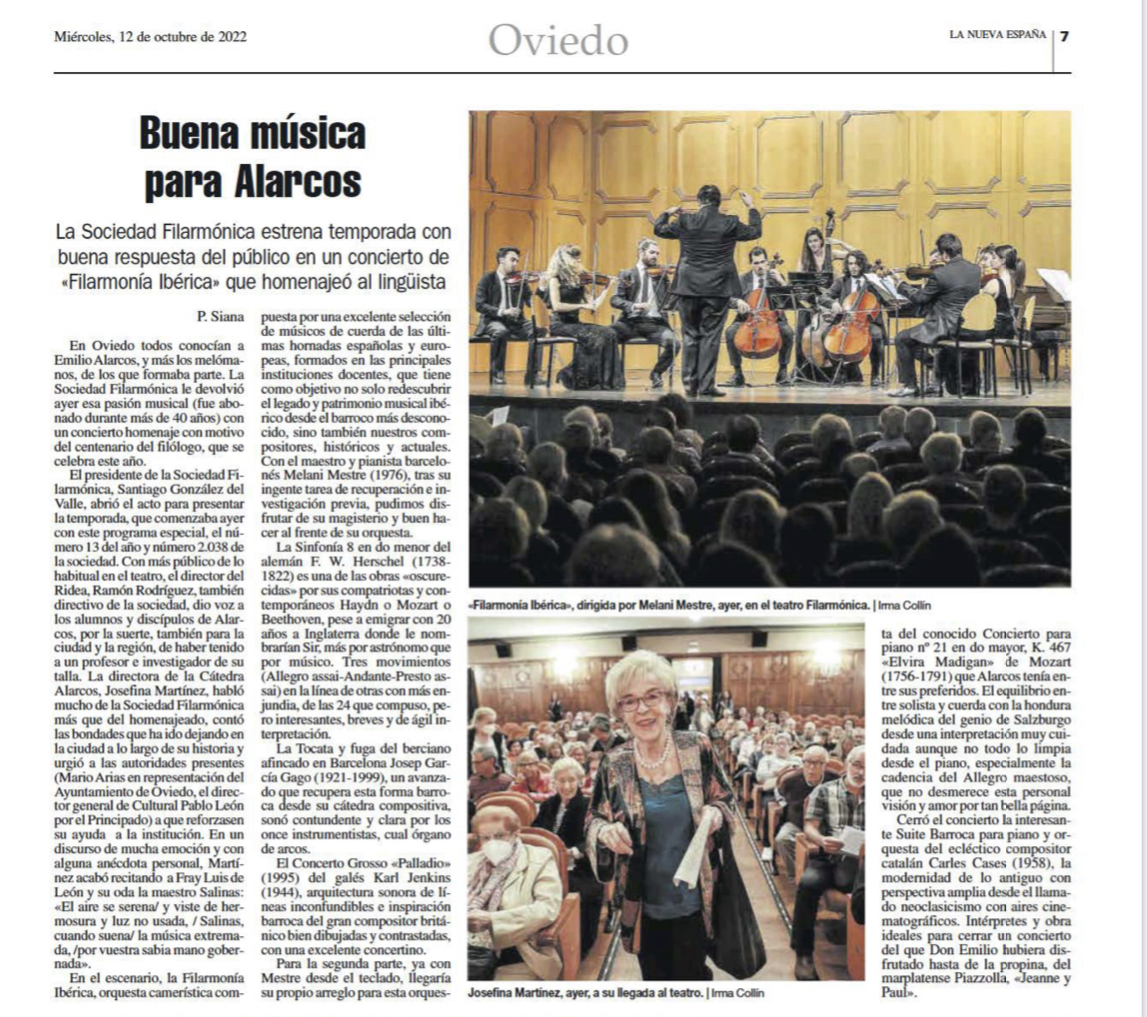 Martes 11 de octubre, 19:45 horas. Sociedad Filarmónica de Oviedo (Teatro Filarmónica), concierto 13 del año, 2.038 de la sociedad: Orquesta Filarmonía Ibérica, Melani Mestre (piano y director). Concierto homenaje a Emilio Alarcos Llorach en el centenario de su nacimiento. Obras de: Herschel, García Gago, Jenkins, Mozart y Cases.