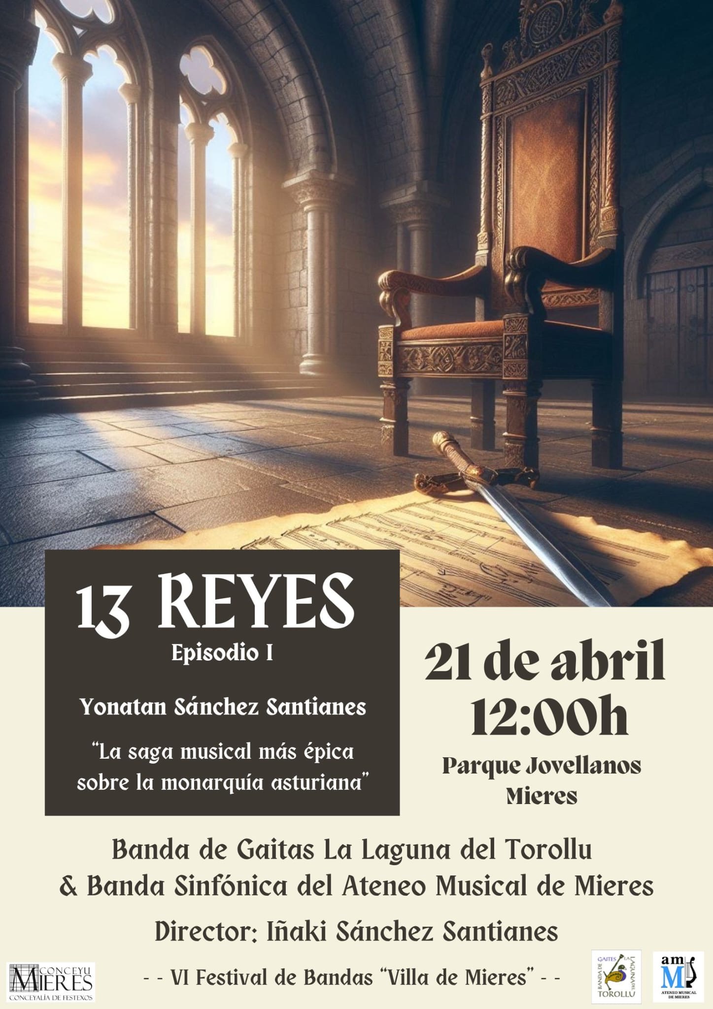 Mantenemos la seña de identidad por ampliar el repertorio de composiciones actuales para banda con obras nuevas, para lo que hemos preparado el estreno mundial de la Suite para banda sinfónica «13 Reyes. Episodio I» (una saga musical épica sobra la monarquía asturiana) del compositor carbayón Yónatan Sánchez Santianes (afincado en Las Palmas de Gran Canaria desde 2007 y actualmente en el Conservatorio Superior de Música de Zaragoza) escrito para nuestra formación en colaboración con la ovetense Banda de Gaites “La Laguna del Torollu” todo bajo la dirección de Iñaki Santianes, con quienes nos hemos hermanado y debutamos dentro de la Folixa Na Primavera el domingo 21 de abril en el VI Festival de Bandas “Villa de Mieres”, así como en las Fiestas de San Xuan la mañana del domingo 16 de junio, presentando una oferta ampliable tanto para el programa “Asturias en RED” (caso de Posada de Llanera donde actuamos el pasado septiembre), como en otras fiestas locales, provinciales, nacionales e internacionales. Nuestra primera salida fuera de España será con un esperadísimo debut del 10 al 18 de agosto en el Festival Intercéltico de Lorient (Bretaña francesa) que este año tiene como lema “La Juventud de los Países Celtas”, siendo la primera vez que actuará una Banda Sinfónica en sus 56 ediciones. Todo un honor llevar el nombre de Mieres y Asturias a esta cita histórica de repercusión mundial al ser retransmitida por “FT1” (la televisión nacional francesa) con una cobertura y visibilidad internacional, donde intentaremos dejar bien alto el pabellón musical de nuestra tierra.