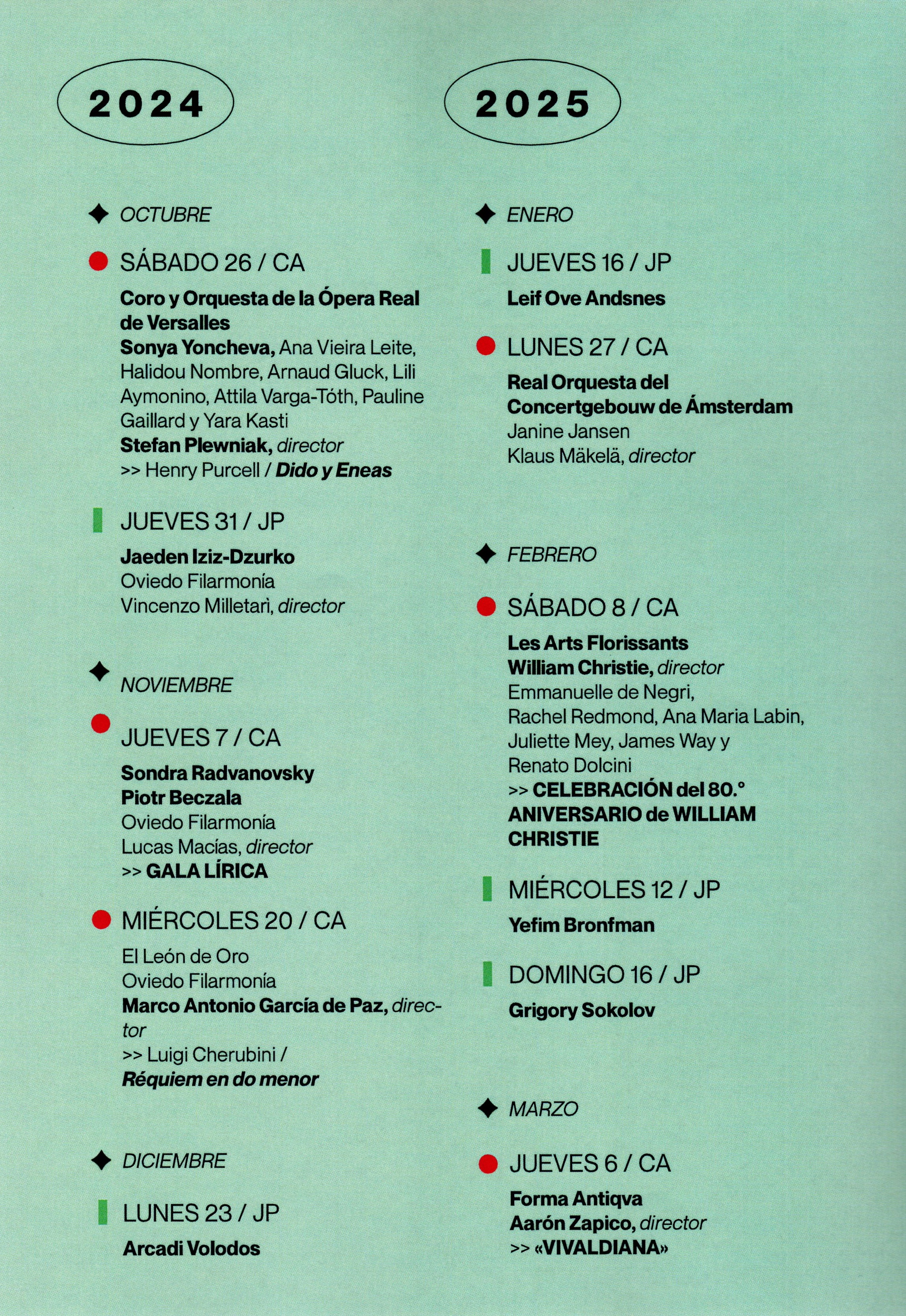 Citando algunos intérpretes tanto asturianos como internacionales, el director Teodor Currentzis con su MusicAeterna será de lo que destacará entre los aficionados, así como los 80 años de William Christie con Les Arts Florissants en una gira por las principales capitales musicales donde Oviedo sigue estando en ese mapa. Destacable la vuelta del oratorio a Oviedo, esta vez con Jephtha (Haendel) que solo se verá en Madrid y Oviedo.
