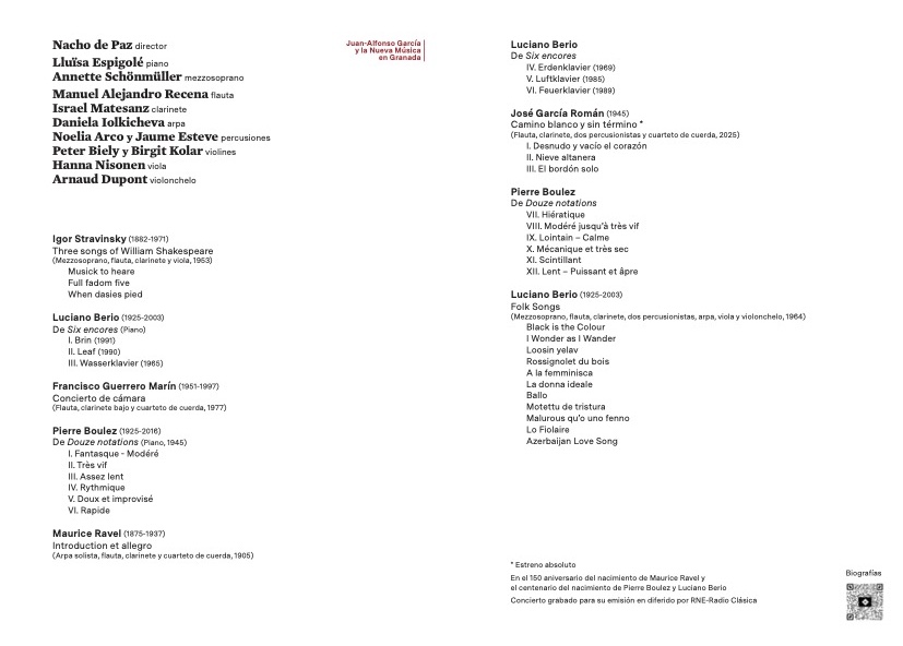Igor Stravinsky (1882-1971): Three songs of William Shakespeare (1953). Francisco Guerrero (1951-1997): Concierto de cámara (1978). Pierre Boulez (1925-2016): Douze notations (para piano solo. 1945). Maurice Ravel (1875-1937): Introduction et allegro (para ensemble. 1905). José García Román (1945): Camino blanco y sin término (2025) *. Luciano Berio (1925-2003): Folk Songs (para voz y ensemble. 1964).