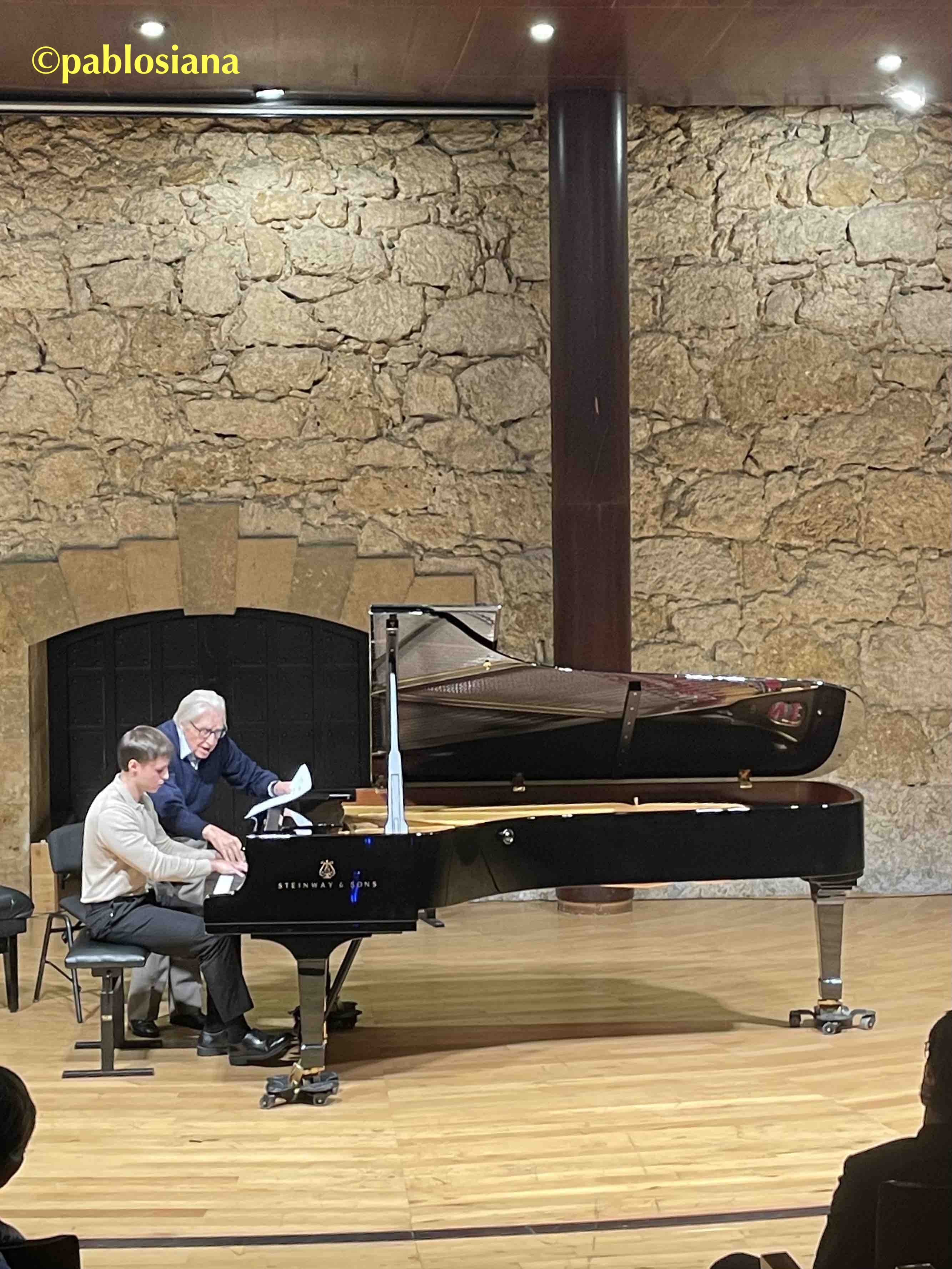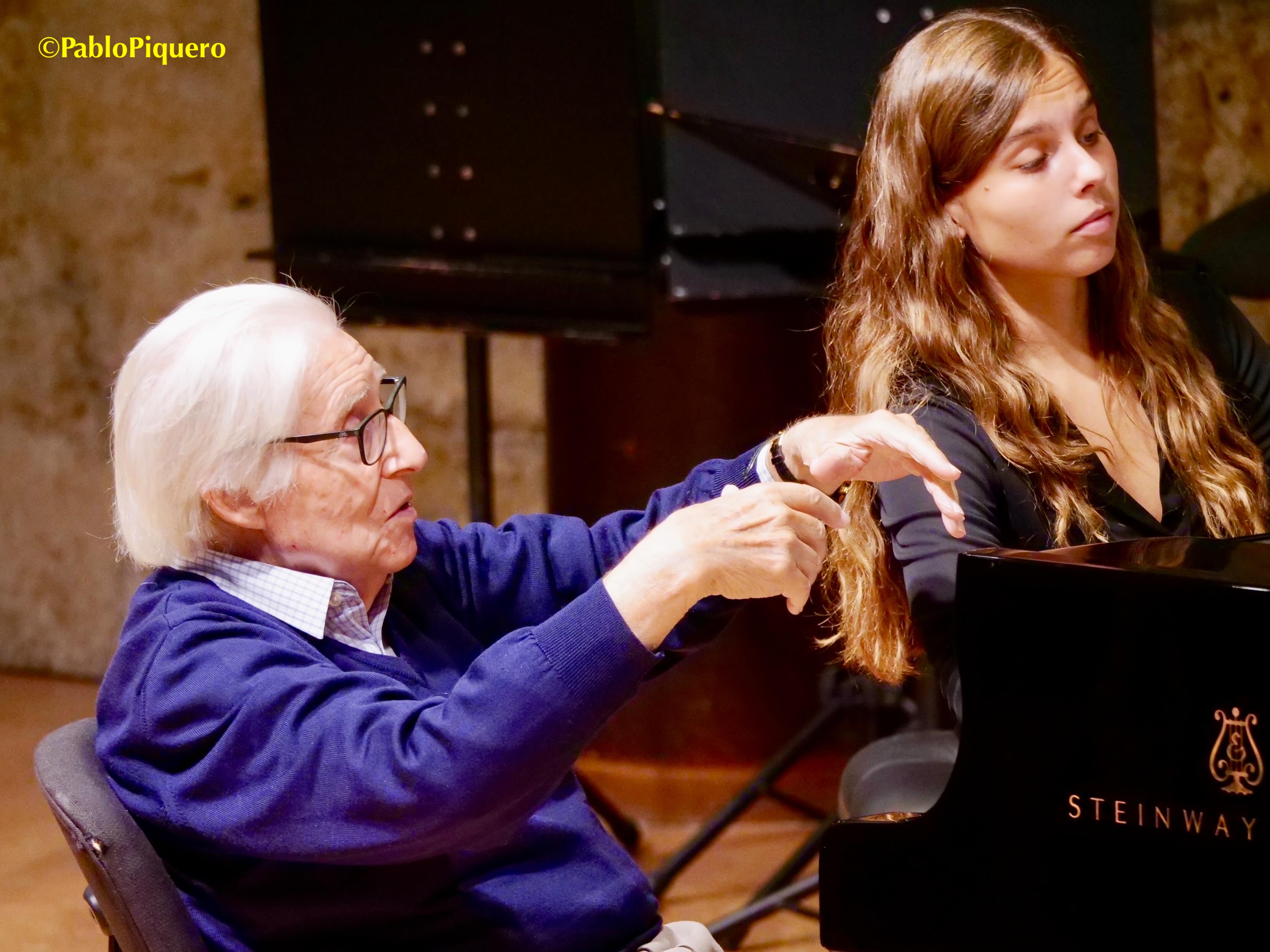 El primero en sentarse con el maestro fue Jose Manuel Argos, con “Otoño”, de Cécile Chaminade. Achúcarro le dejó interpretar la pieza hasta el final y luego fue introduciendo matices en el tempo. Le aconsejó alargar unos ritardandos para tener un arco de dinámicas más amplio en determinadas frases. Incapaz de estarse quieto, en una forma envidiable a sus 92 años, a los pocos minutos Achúcarro ya estaba de pie, chasqueando los dedos para marcarle el ritmo a Argos.