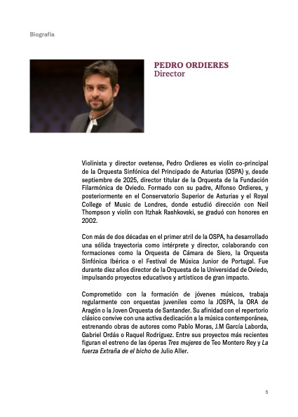El compositor Gabriel Ordás (1999) comenta sobre su obra de estreno Bosque (2025) «el crepúsculo, la densidad del aire, la altura de los árboles, el canto de un pájaro, el eco distante… En mi primer contacto con el poema de Ángel González que inspira esta obra, me sentí transportado a un bosque donde las últimas horas de sol teñían de naranja los árboles en un día frío. Esta escena congelada en mi mente persistió a lo largo del proceso compositivo de la partitura, retrotrayéndome al pasado y llevándome a retomar las primeras tres notas de mi obra Luces de un cielo nocturno, que aluden precisamente al atardecer, pero haciéndolas repetirse aquí una y otra vez hasta volverlas un cuerpo hierático. El verso ‘Andas. No dejan huellas tus pies’ inspiró el segundo tema de la obra, que cita lejanamente el preludio Huellas en la nieve de Claude Debussy, una de las mejores representaciones de pasos jamás escritas en pentagrama. En los últimos compases ambos temas suenan simultáneamente, entremezclándose y desapareciendo, sugiriendo la belleza de aquello que se percibe como eterno, pero es efímero».