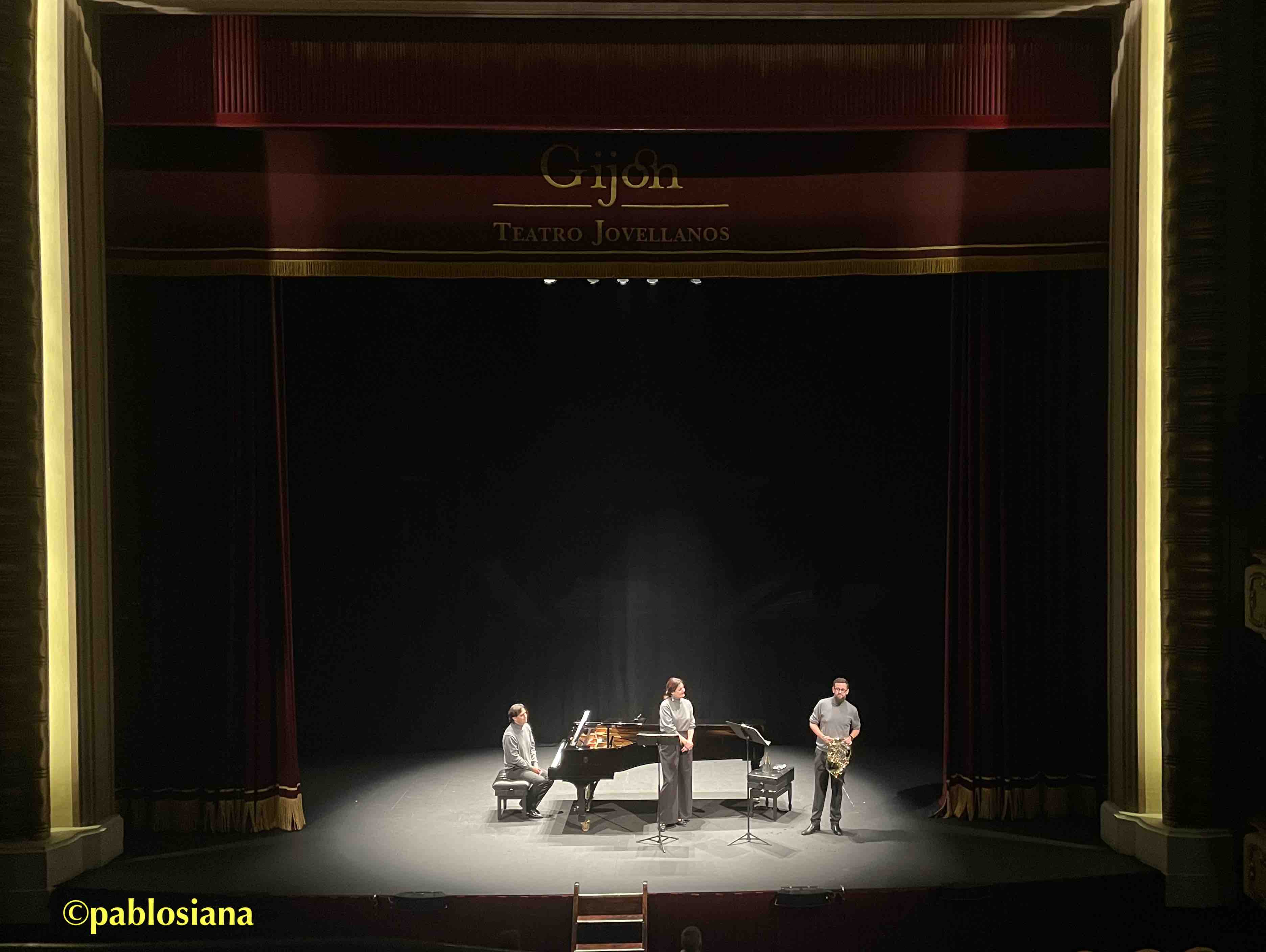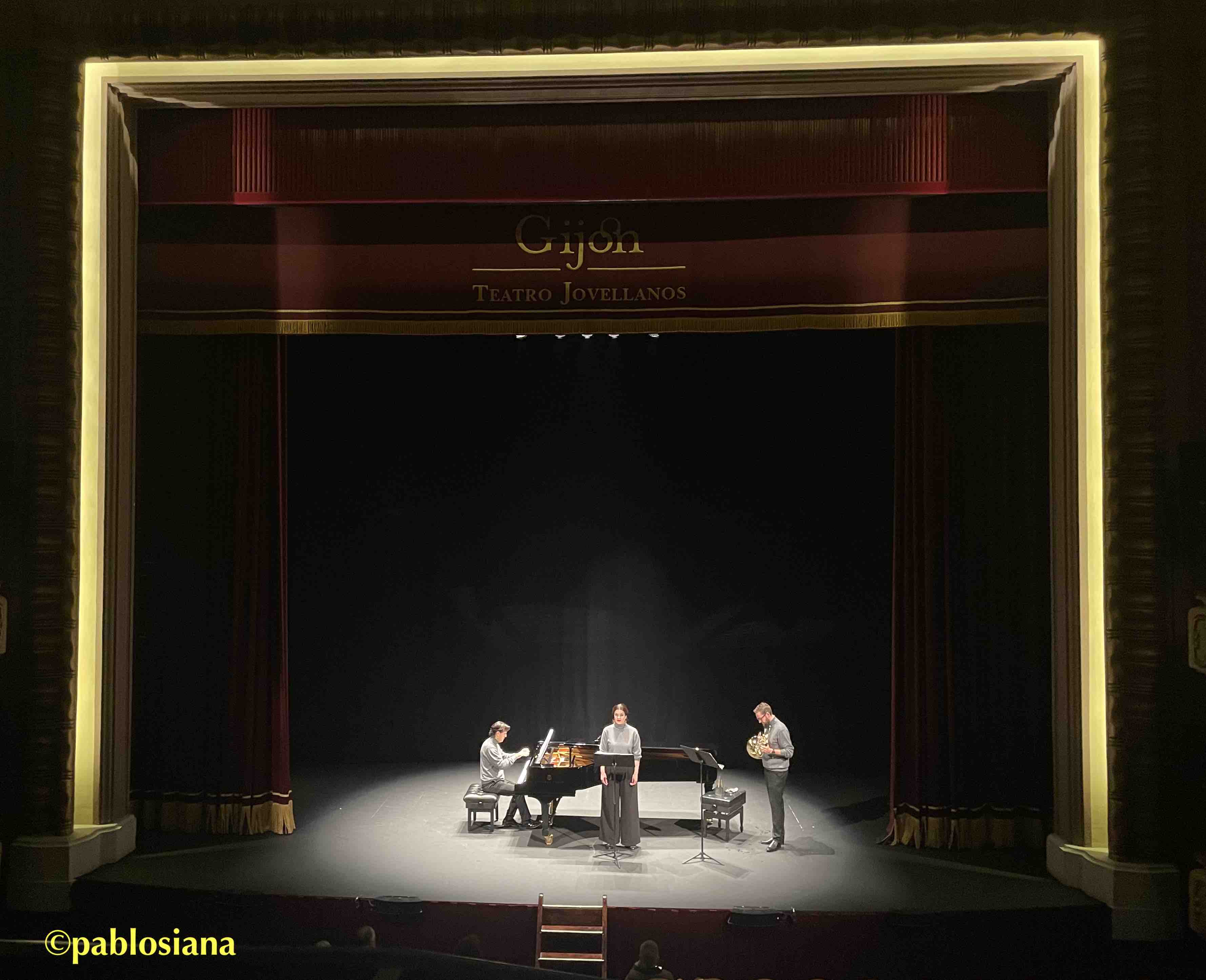 Siempre resulta interesante asistir a un recital donde la poesía se une con la música, matrimonio indisoluble aunque no esté sobre un pentagrama. Si le sumamos que la formación era el Trío Preseli (creado en 2021) con la soprano María Hinojosa, la trompa de Simon Lewis y el piano de Daniel Pereira González, la sonoridad y tímbrica propia, que ya disfrutamos en este mismo teatro el 3 de abril del pasado año, me servía para volver a titular esta entrada como entonces, «El oscuro romanticismo» pero había mucha música de nuestro tiempo así como dos compositores asturianos que no quería perderme, incluyendo un estreno absoluto.