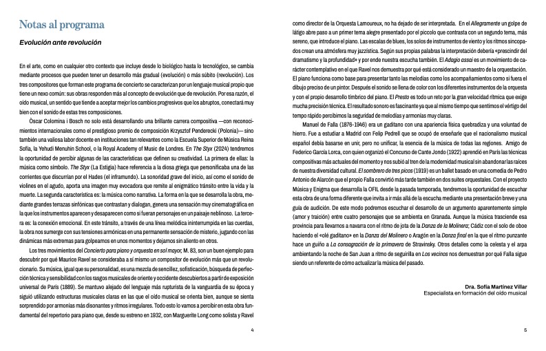 Las notas al programa nos explican que los tres movimientos de este concierto «son un buen ejemplo para descubrir por qué Maurice Ravel se consideraba a sí mismo un compositor de evolución más que un revolucionario. Su música, igual que su personalidad, es una mezcla de sencillez, sofisticación, búsqueda de perfección técnica y sensibilidad con los rasgos musicales de oriente y occidente descubiertos a partir de exposición universal de París (1889). Se mantuvo alejado del lenguaje más rupturista de la vanguardia de su época y siguió utilizando estructuras musicales claras en las que el oído musical se orienta bien, aunque se sienta sorprendido por armonías más disonantes y ritmos irregulares. Todo esto lo vamos a percibir en esta obra fundamental del repertorio para piano que, desde su estreno en 1932, con Marguerite Long como solista y Ravel como director de la Orquesta Lamoureux, no ha dejado de ser interpretada». Y si The Styx me dejaba inquietud, este Ravel pianístico como bien escribe Sofía Martínez, «el resultado sonoro es fascinante ya que al mismo tiempo que sentimos el vértigo del tempo rápido percibimos la seguridad de melodías y armonías muy claras».