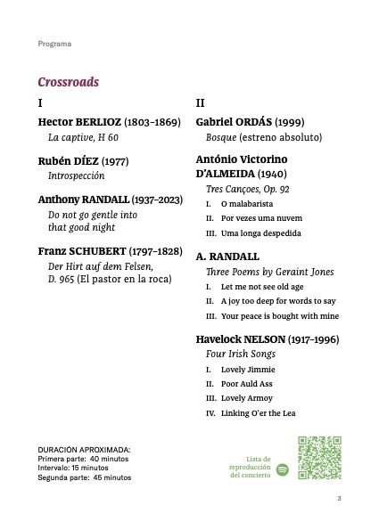 El programa titulado «Cruzando caminos» (Crossroads) viene perfectamente explicado en el programa de mano (que dejo enlazado) con las notas escritas por el galés Simon Lewis (aún recuerdo su paso por la Oviedo Filarmonía y actualmente en la Bilbao Orkestra Sinfonikoa), que también aprovechó para contar algunas anécdotas mientras cuidaba y limpiaba la trompa. De ellas iré insertando píldoras según voy comentando cada obra, y sobre la originalidad del trío decir que está en su propia idiosincrasia: tender puentes entre las culturas gallega y galesa (pianista y trompista). No faltarían por tanto letras en inglés, gallego, también alemán y por supuesto nuestro castellano, exigencias para una María Hinojosa Montenegro a la que seguimos hace años por nuestra tierra, como todos los cantantes, resulta políglota y estudiosa de cada idioma para poder expresar tanto de unos textos que dejo enlazados y la propia Sociedad Filarmónica de Gijón ubicó en varios lugares con un código QR para poder descargarlos e ir siguiéndolos a medida que se iban escuchando (me consta que no había tiempo para proyectarlos, aunque así evitábamos «distraer la mirada» y concentrarnos en la audición, que a menudo realizo con los ojos cerrados). Seguir aplaudiendo la incorporación en Spotify© de las listas con las obras de cada concierto en versiones de referencia y añado los links (enlaces).