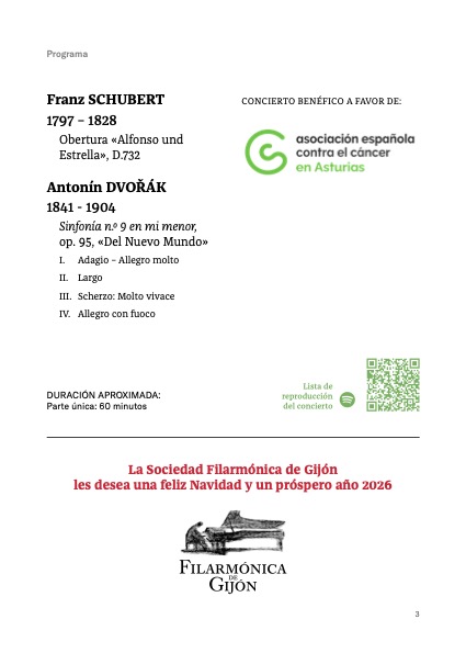 Miércoles 17 de diciembre, 20:00 horas. Teatro Jovellanos: Concierto nº 1.706 de la Sociedad Filarmónica de Gijón (a beneficio de la Asociación Española Contra el Cáncer). Orquesta de la Fundación Filarmónica de Oviedo, Pedro Ordieres (director). Obras de Schubert y Dvořák.