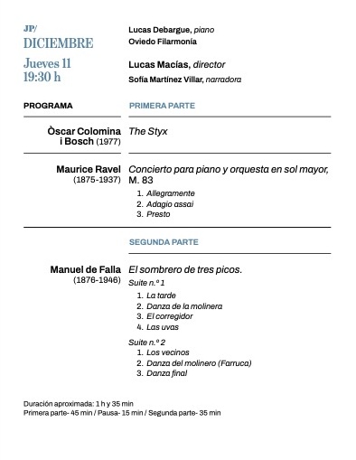 Jueves 11 de diciembre, 19:30 horas. Auditorio de Oviedo, Jornadas de Piano “Luis G. Iberni”: Lucas Debargue (piano), Oviedo Filarmonía, Lucas Macías Navarro (director), Sofía Martínez Villar (narradora). “Música y enigma II”, obras de Òscar Colomina i Bosch, Ravel y Falla.
