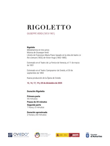 Domingo 14 de diciembre de 2025, 19:00 horas. Teatro Campoamor, Oviedo: LXXVIII Temporada de Ópera. G. Verdi (1813-1901): «Rigoletto», melodrama en tres actos, con libreto Francesco Maria Piave, basado en la obra de teatro “Le Roi s’amuse”  (1832) de Victor Hugo. Estrenado en el  Teatro de La Fenice de Venecia, el 11 de marzo de 1851. Nueva producción de la Ópera de Oviedo.