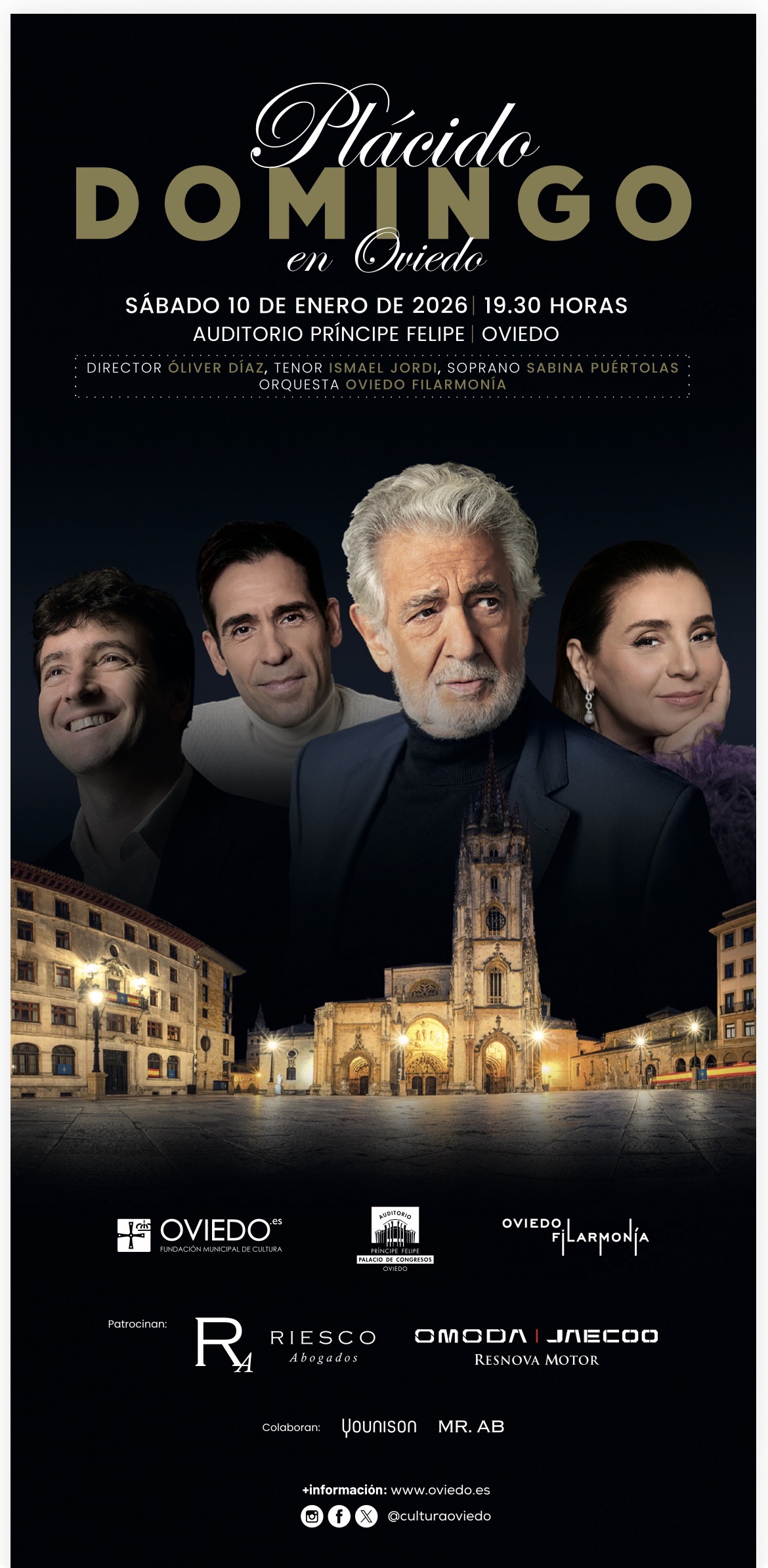 Sábado 10 de enero, 19:30 horas. Auditorio Príncipe Felipe, Oviedo: “Gala Lírica” con Plácido Domingo (barítono), Ismael Jordi (tenor), Sabina Puértolas (soprano), Oviedo Filarmonía, Óliver Díaz (director). Entradas: 89€ y 79€, con la colaboración de la Fundación Municipal de Cultura de Oviedo y el patrocinio de Riesco Abogados y Grupo Resnova.