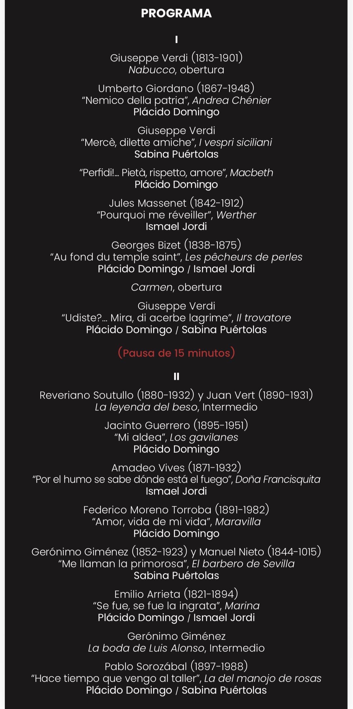 La primera parte operística fue alternando las primeras arias de soprano y tenor con un Plácido verdiano más dos dúos con cada uno de ellos. Primero una Puértolas en estado de gracia (“Mercè, dilette amiche” de las Vísperas), impecable, de agilidades cristalinas y entrega total, después Jordi con el Werther capaz de olvidarnos de Kraus (perfecto su “Pourquoi me réveiller” de dicción, matices, color e interpretación) junto al Macbeth (“Perfidi!… Pietà, rispetto, amore”) de un Domingo que “capea el temporal” pero sigue emocionando por sus tablas y oficio.