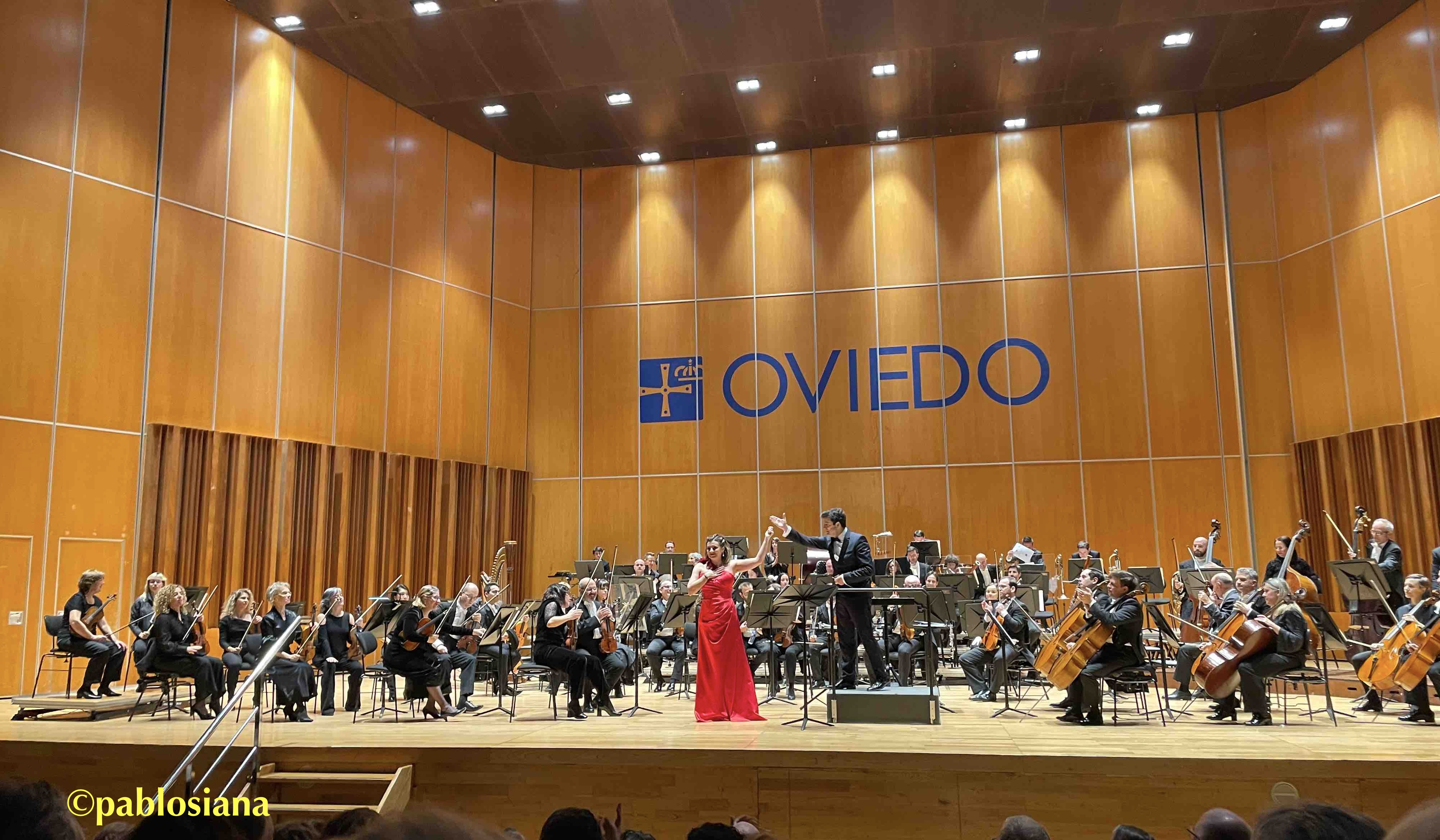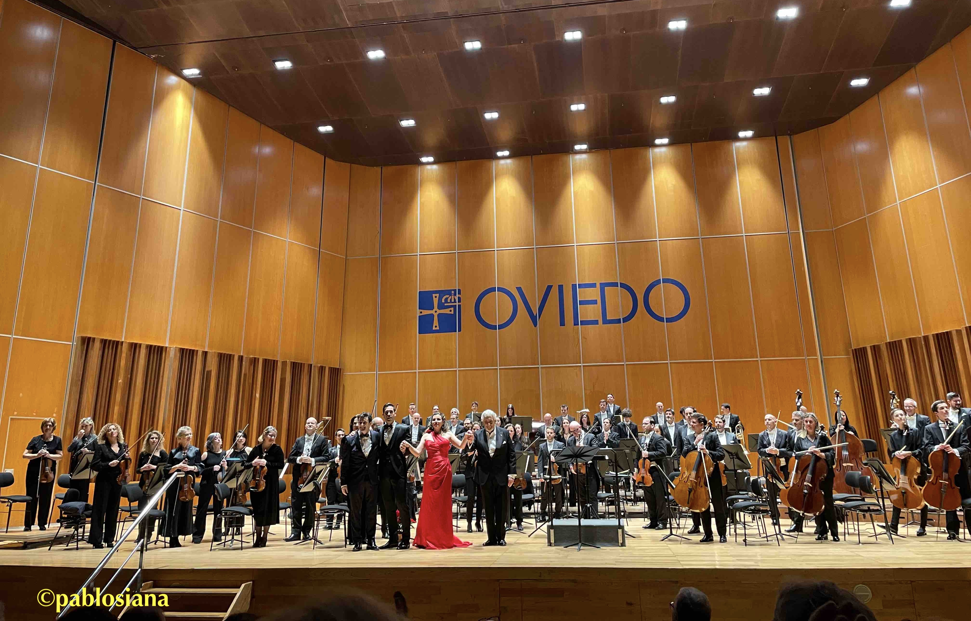 La zarzuela goza también en Oviedo del mimo y respeto de una afición lírica que entiende y exige, disfrutando cuando las voces responden y la orquesta las ayuda con igual calidad. El famoso intermedio de La leyenda del beso sonó completo y no recortando el arpa virtuosa que abre la parte más conocida de esta zarzuela de Soutullo y Vert. “La aldea” de Domingo no levantó el vuelo cual gavilán ni brilló con el esmalte de barítonos que la han hecho casi carta de presentación, pero escuchar al octogenario interpretarla aunque bajada de tono, sigue emocionando porque son romanzas que hemos heredado de nuestros abuelos y padres conociéndolas casi como “Las 40 principales” de varias generaciones. Otro tanto con la Maravilla de “Amor vida de mi vida” que ha perdido parte del encanto de esta romanza que el madrileño ha llevado por todo el mundo y continúa en el repertorio casi cual seña de identidad de la “segunda etapa” de Domingo.