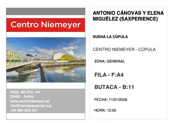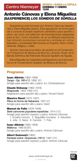 Domingo, 11 de enero, 12:00 horas. Centro Niemeyer, Avilés. “Suena la cúpula”: Saxperience –Antonio Cánovas (saxos alto y soprano) & Elena Miguélez (piano)-. «Los sonidos de Sorolla». Obras de Albéniz, Debussy, Ravel, Falla y Guinovart. Entrada: 12€ + 1€ por gestión (!).
