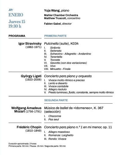 En esta gira española de Wang y la MCO que arrancaba el día antes en el Palau de la Música Catalana, Oviedo sigue estando en el mapa, parada antes de Donosti y el salto a las Islas Canarias dentro de su Festival, con un programa lo suficientemente ensayado, por lo que hay que calificar de éxito rotundo tanto por las obras como por la respuesta de un público rendido a Wang, que desde Barcelona comentaban en las RRSS: «Puro virtuoso, elegancia y magnetismo. Ayer (…) la gran Yuja Wang y la Mahler Chamber Orchestra realizaron el desafiante ‘Concierto para piano’ de Ligeti, una obra de extrema complejidad, llena de ritmos irregulares y fascinantes texturas. Completaron la velada con el refinamiento neoclásico de la ‘Pulcinella Suite’ de Stravinsky, una selección del ‘Idomeneo’ de Mozart y el puro lirismo del ‘Concierto para piano nº 1’ de Chopin bajo la dirección de Fabien Gabel. ¡Otra noche de contrastes para recordar con entradas agotadas!». Se podría suscribir literalmente para este tercer jueves de enero en Oviedo.