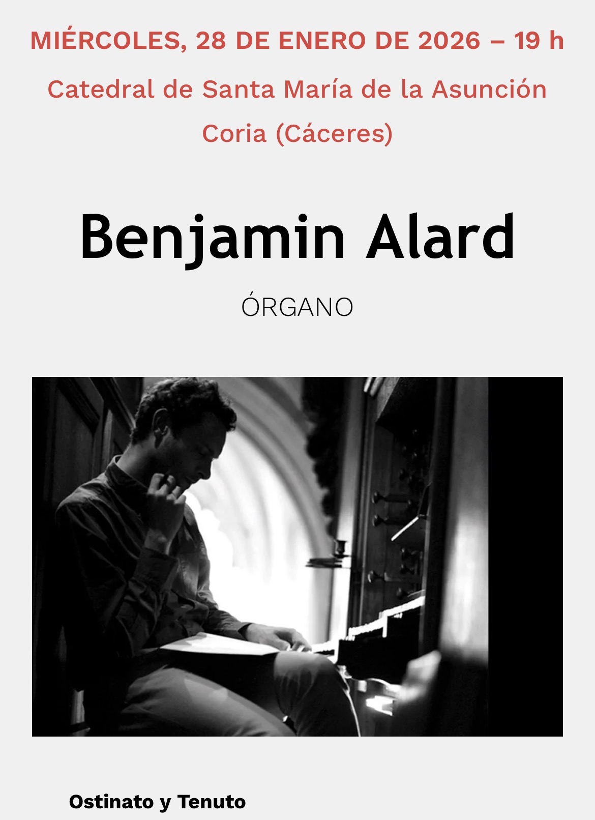 Miércoles, 28 de enero, 19 horas. 4ª edición Atrium musicae. Concierto inaugural: Coria, Catedral de Santa María de la Asunción: Benjamin Alard (órgano): Ostinato y Tenuto. Obras de Muffat, Froberger, Couperin, Pachelbel, Bach y Grigny.