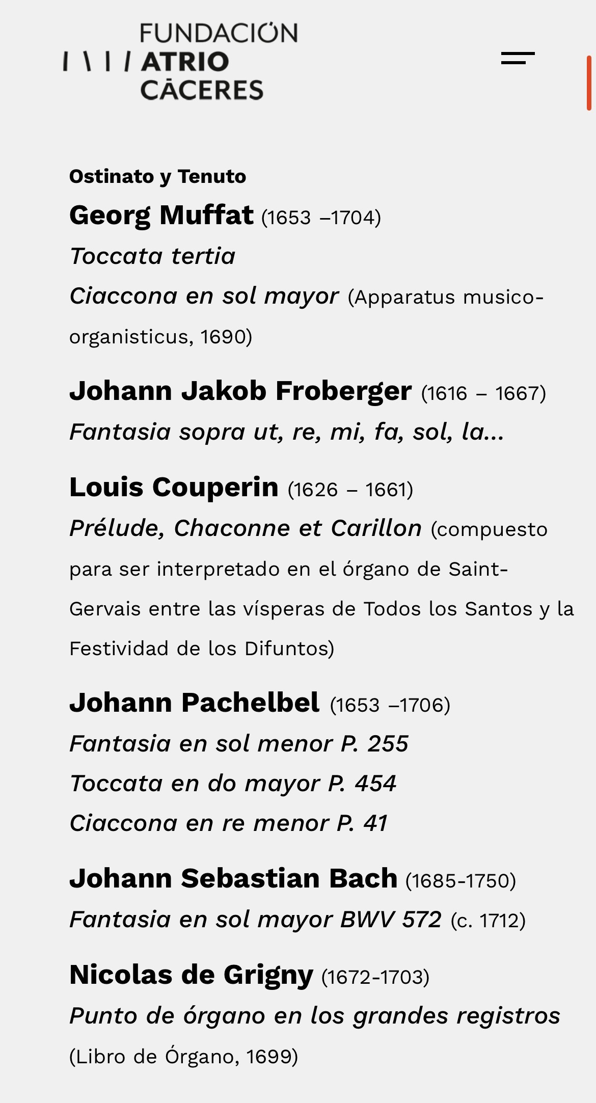 Sin analizar cada obra, o grupo de ellas, abundaron las «chaconas» variadas en tímbricas y aires, prologadas por las virtuosas tocatas, como la inicial de Muffat (de agudos prístinos), preludios o las «fantasías», que lo fueron literalmente, como la maravillosa de Froberger sobre las notas que fueron sonando para mostrando la riqueza de registros de esta joya organística del barroco extremeño explorando registros de 2″ y 4″ verdaderamente celestiales.