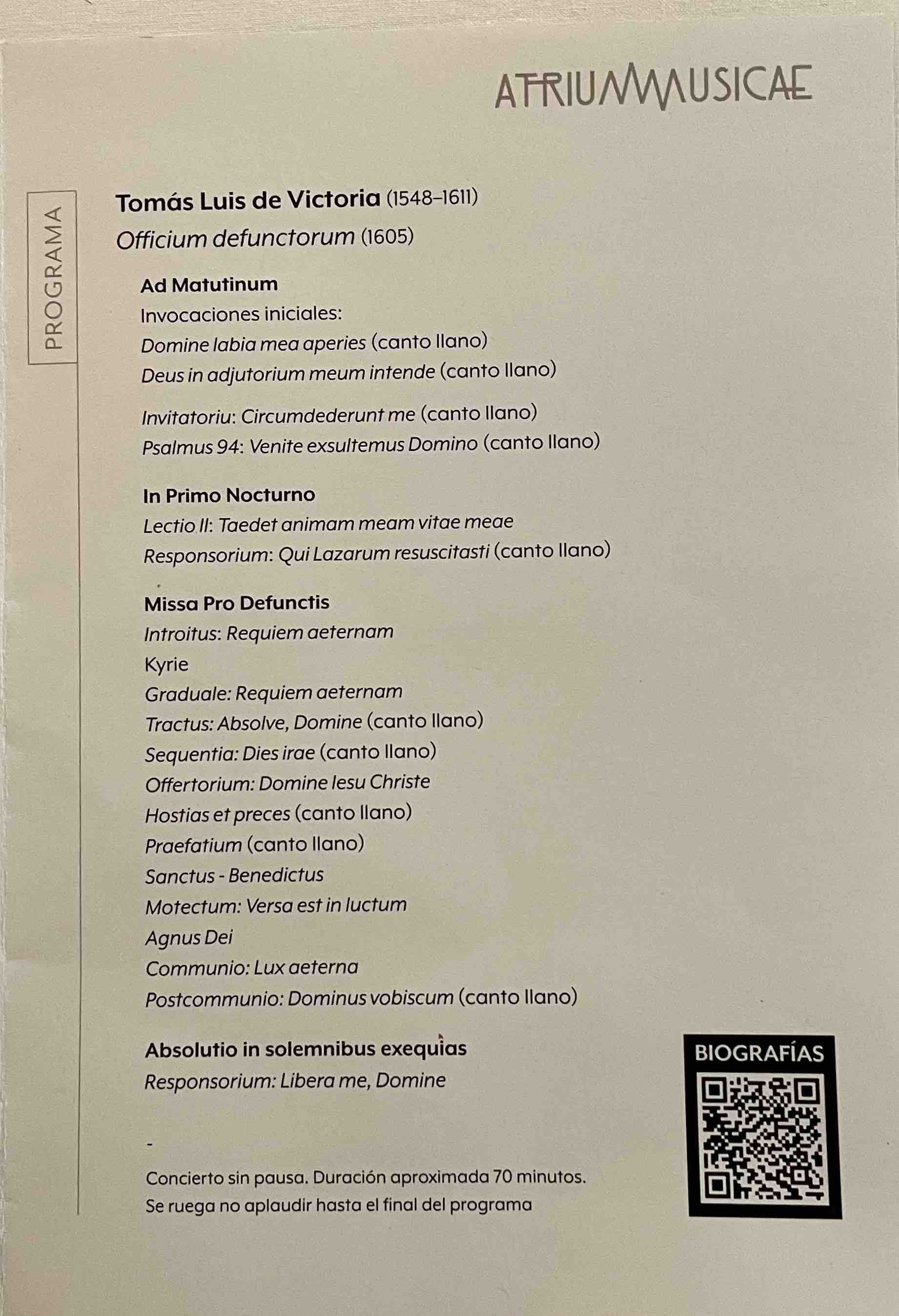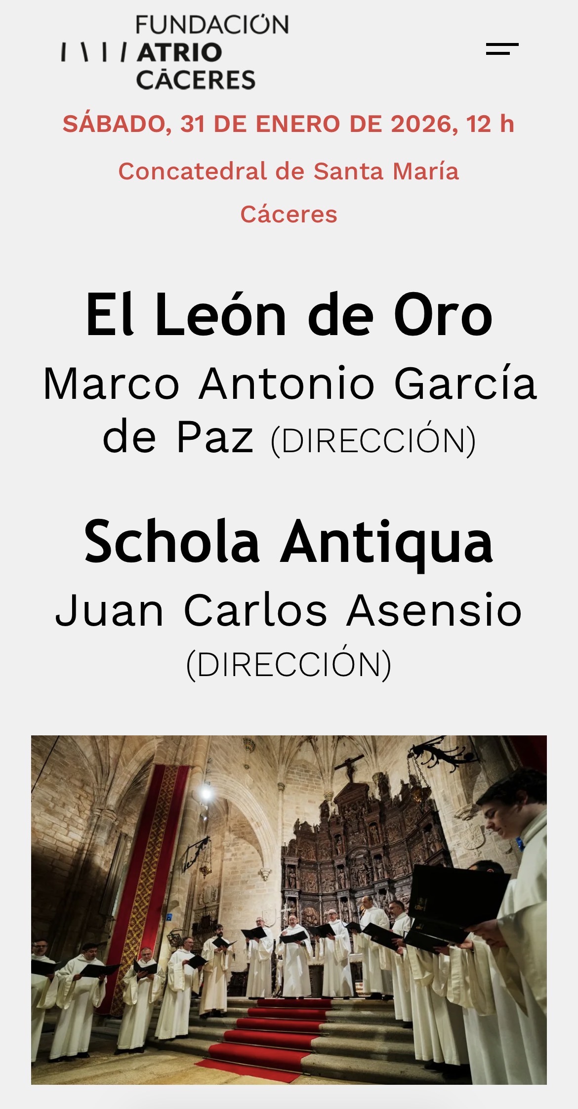 Sábado 31 de enero, día 4 del Festival Atrium Musicae. Concatedral de Santa María, Cáceres, 12:00 horas: El León de Oro (director: Marco Antonio Gª de Paz), Schola Antiqua (director: Juan Carlos Asensio): “Un Réquiem para la eternidad”. Victoria: Officum defunctorum.