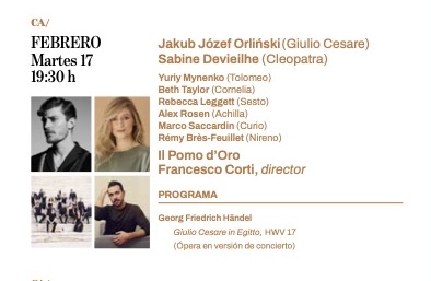 Y dos contratenores más en el elenco, igualmente ideales en la elección por color y expresividad, comenzando por el Tolomeo del ucraniano Yuriy Mynenko, (porque no solo para barítonos son los roles de “los malos de la película”), de color uniforme incluso en los agudos forte que llenaban el auditorio, más el Nireno del francés Rémy Brès-Feuillet brillando en sus intervenciones de un “secundario” de nivel. Completó este equilibrado reparto el Curio del barítono italiano Marco Saccardin, aplaudiendo el acierto de unas voces que elevaron esta cita lírica en concierto hasta límites y calidades increíbles.