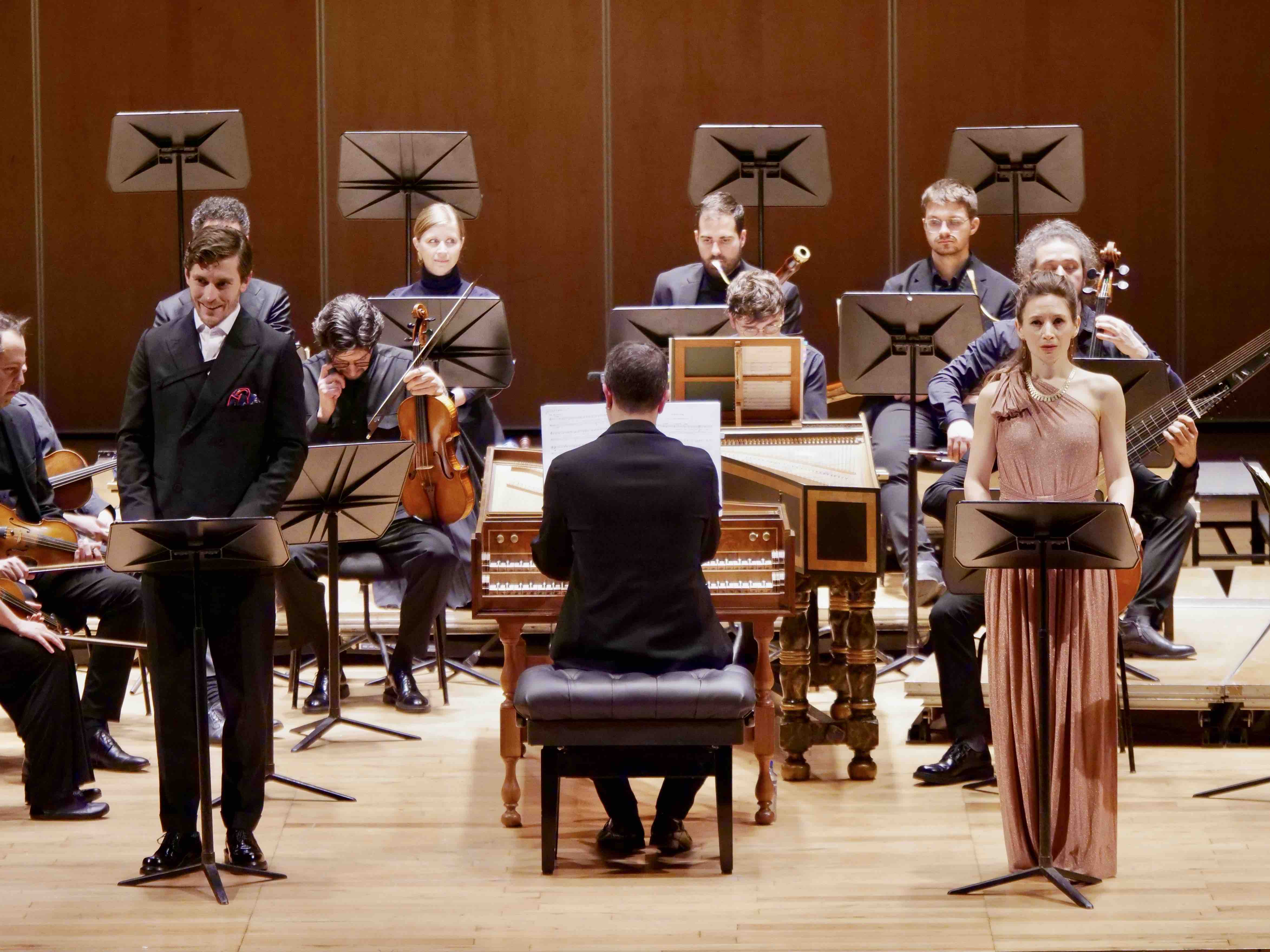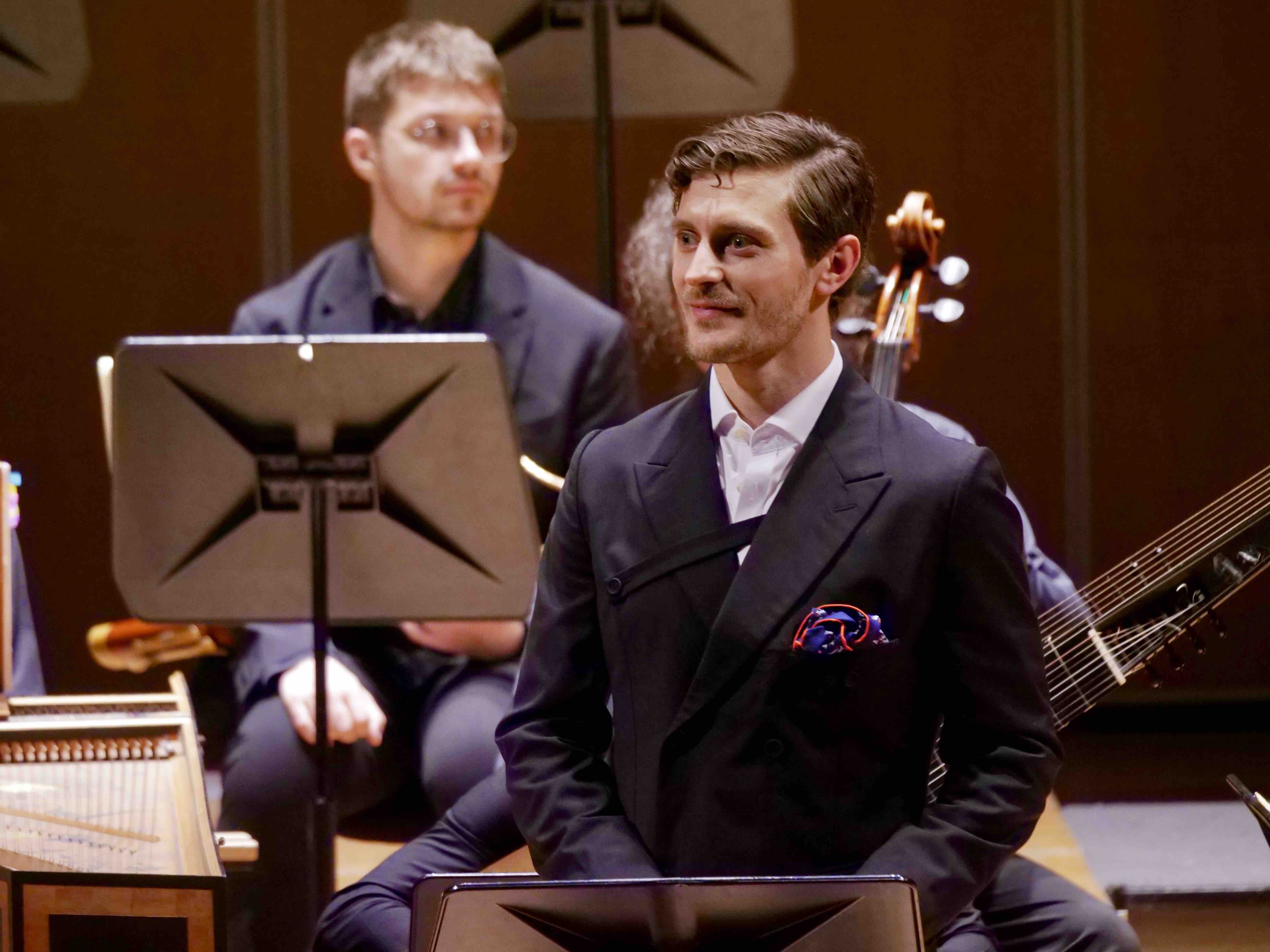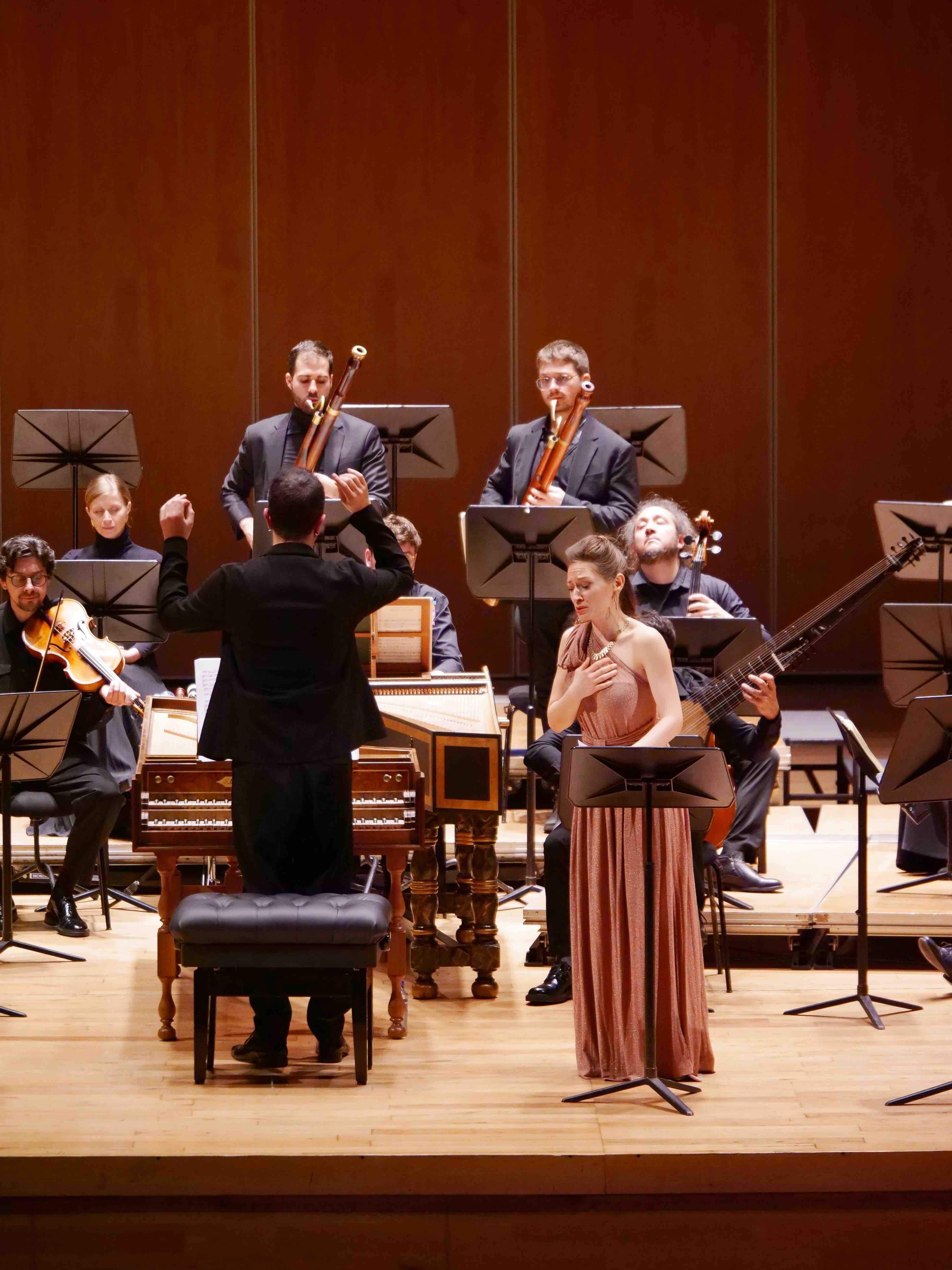 De los números musicales destacar en primer lugar que Il Pomo d’Oro es un lujo en su orgánico y su sonoridad compacta, cuidada y bien balanceada en cada número instrumental, también el perfecto ropaje para las voces con un continuo de altura (además del propio Corti al clave que las mima) junto a Guillaume Haldenwang en el segundo clave -casi arpa que no estaba- junto al tiorbista Miguel Rincón, o los dos chelos más la viola de gamba; seguir sumando dos contrabajos escoltando el “grosso” para dar el cimiento y sustento grave, una madera donde Petra Dámec Ambrosi alternaría el trasverso con la flauta de pico y hasta uno de los oboes, dos fagotes que citaré más adelante (con Ángel Álvarez doblando la flauta) y el puntual cuarteto de trompas naturales donde el dúo de Christian Biende en el aria nº 15 de la escena IX con Giulio Cesare demostró la calidad y perfecto ensamblaje con Orliński, desde la siempre difícil afinación y un timbre redondo.