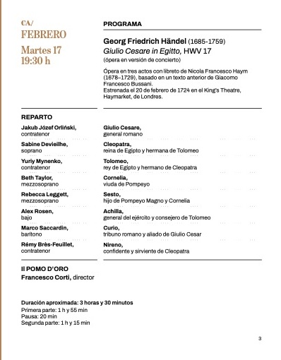 Martes 17 de febrero, 19:30 horas. Conciertos del Auditorio, Oviedo: Georg Friedrich Händel (1685-1759): Giulio Cesare in Egitto, HWV 17 (ópera en versión de concierto). Ópera en tres actos con libreto de Nicola Francesco Haym (1678–1729), basado en un texto anterior de Giacomo Francesco Bussani. Estrenada el 20 de febrero de 1724 en el King’s Theatre, Haymarket, de Londres. Fotos de Pablo Piquero.