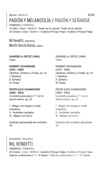 Comentaba el maestro Zorita lo habitual que es en la orquesta asturiana programar obras contemporáneas que no suelen repetirse pese a que muchas resultan verdaderos éxitos, y Venditti nos contó lo que la compositora Gabriela Ortiz (Ciudad de México, 20 de diciembre de 1964) refleja en su obra, la conexión entre Clara y Robert Schuman, los momentos de esta relación y los papeles dados al oboe (Robert) y violín (Clara) más su forma de comunicarse precisamente con la música. También las notas al programa de mi admirado Ramón Sobrino nos prepararon para entender aún más esta obra compuesta en 2021 por encargo de la New York Philharmonic y estrenada el 10 de marzo de 2022 bajo la dirección de Gustavo Dudamel. Ubicar a continuación la «Sinfonietta» del alemán es rememorar al Schumann juvenil, despojado del tempo lento en esta «piccola sinfonia» por ser demasiado íntimo en un momento de euforia juvenil. Y por supuesto hablarnos del archiconocido concierto de piano de Tchaikovski donde aparecen motivos del folklore ruso con las características melodías también en los cellos y violas («no como Puccini que las escribe todas para los violines»), aunque retomaría para finalizar el encuentro desmenuzándonos la obra de la mexicana.